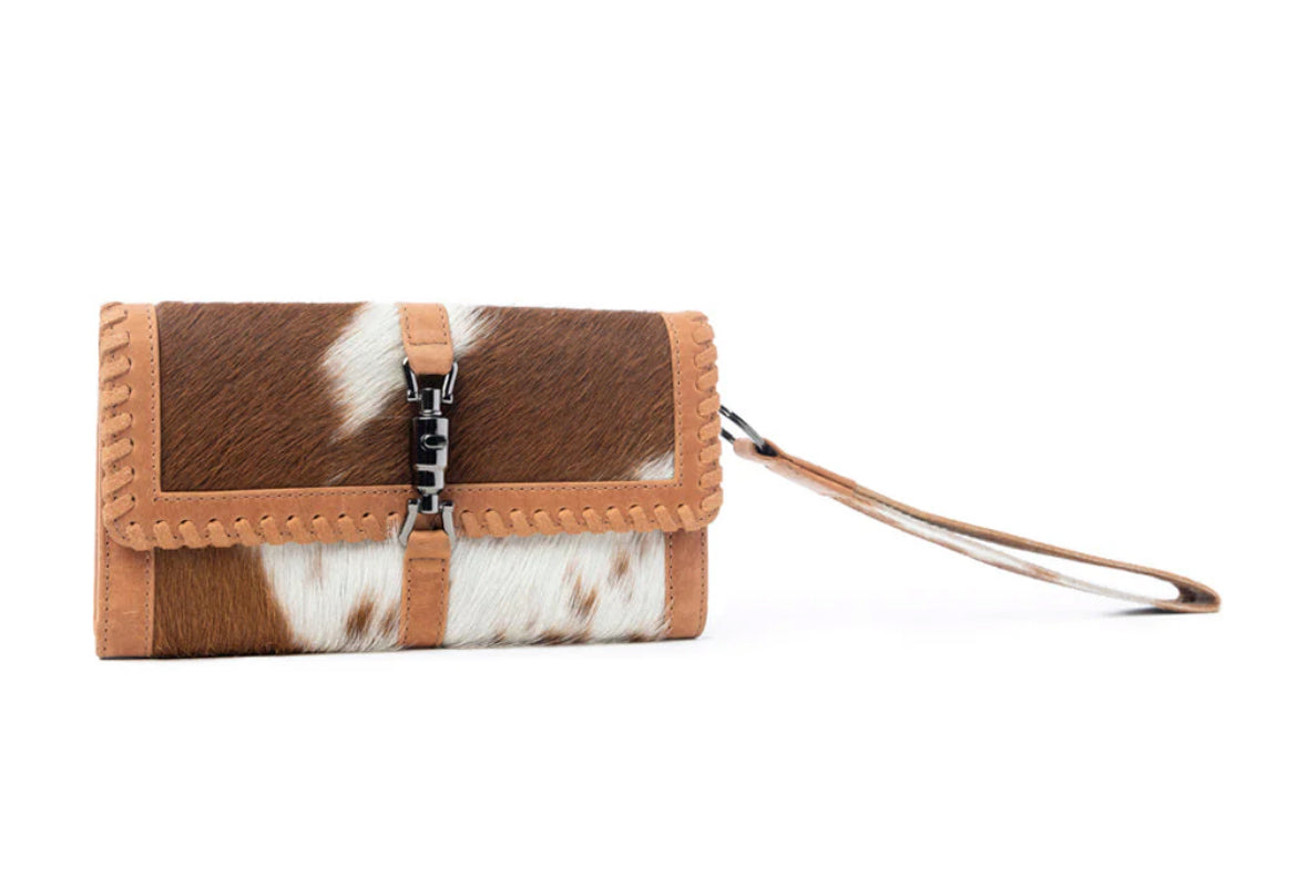 Step into rustic Western elegance with the Myra Oracle Ember Hairon Leather Wallet, crafted for those who love authentic charm and practical function. Designed from premium hairon leather with smooth leather trims, this leather ridge wallet exudes natural texture and rugged appeal. The whipstitch weaving detail across the edges adds an artisanal touch, while the secure front clasp keeps your essentials safe. A detachable wristlet makes it easy to carry on its own or slip inside a larger bag. Perfect for rodeo nights, country concerts, or everyday use, this miss western wallet is a versatile piece blending durability with cowboy-inspired style.