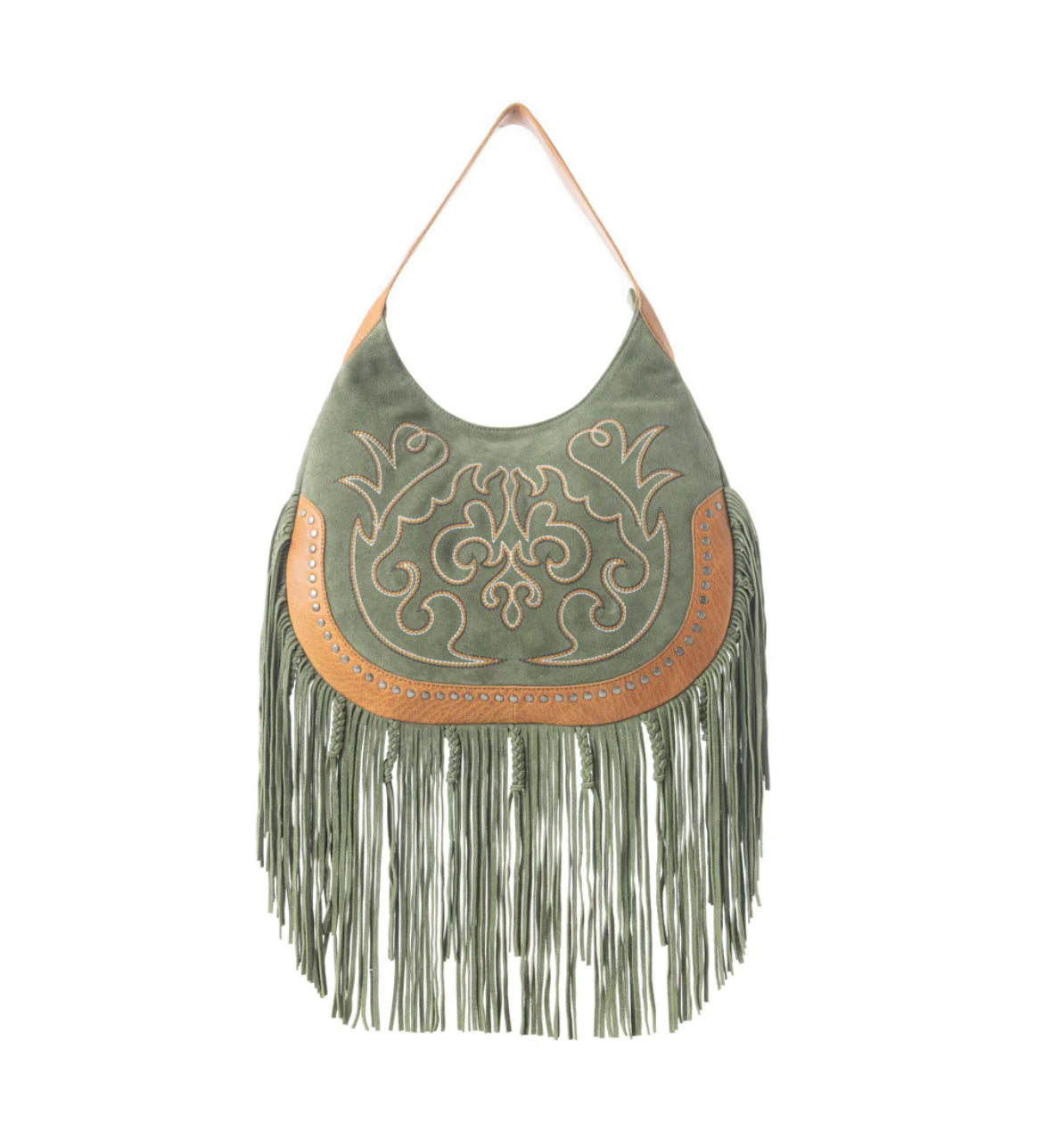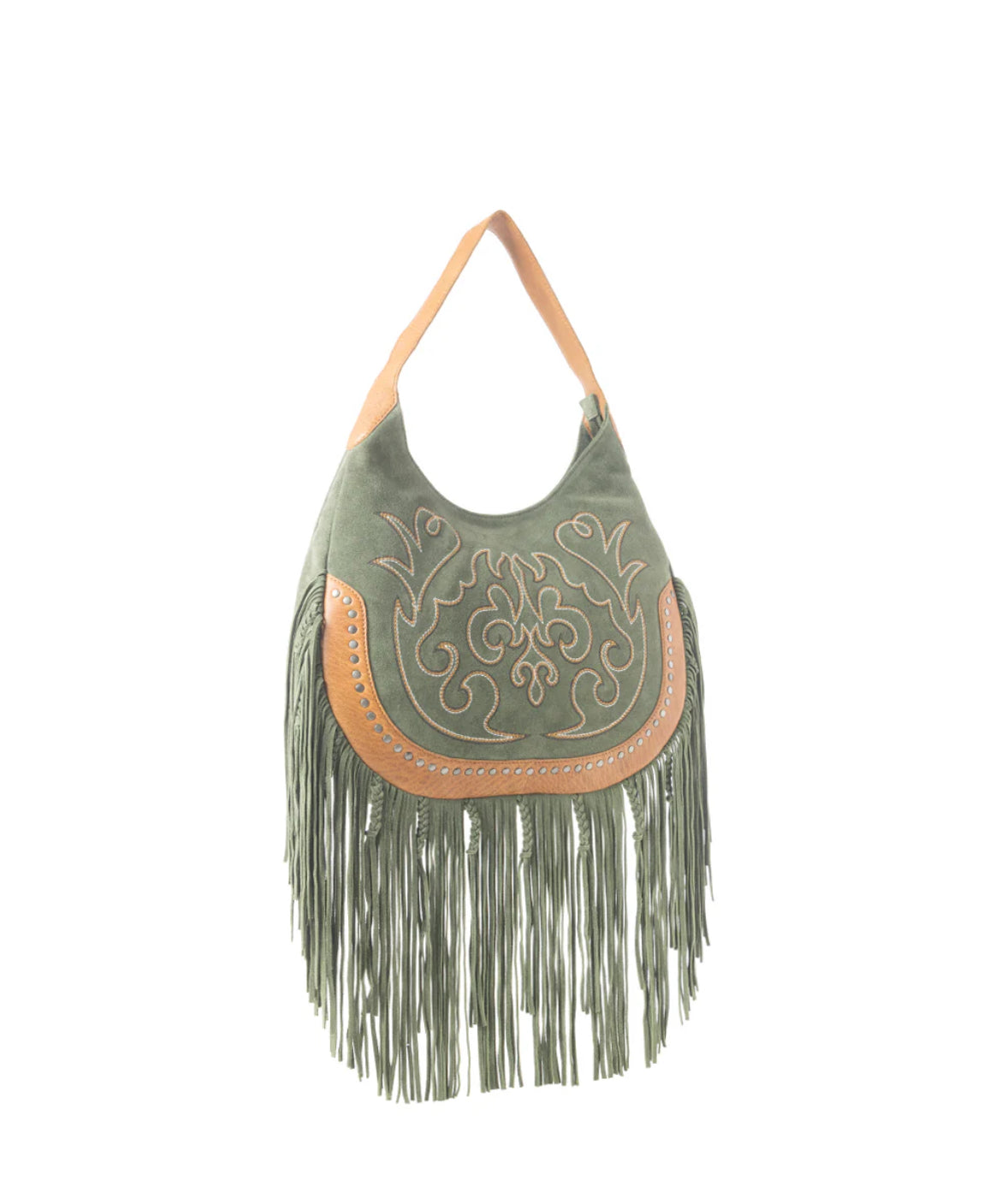 The Myra Sage Whisper Fringe Leather Bag in Pearl Whitebeautifully balances rustic charm with refined everyday elegance. With its structured silhouette and soft pearl hue, this Western leather handbag adds a touch of Western flair to your wardrobe. The flap closure is accented with antique-finish hardware and subtle stud detailing, giving it that rugged yet refined appeal. Designed for comfort and convenience, it includes an adjustable strap for versatile styling. Perfect for a day in town or a night at a country concert, this western leather bag is built to keep up in style and function.