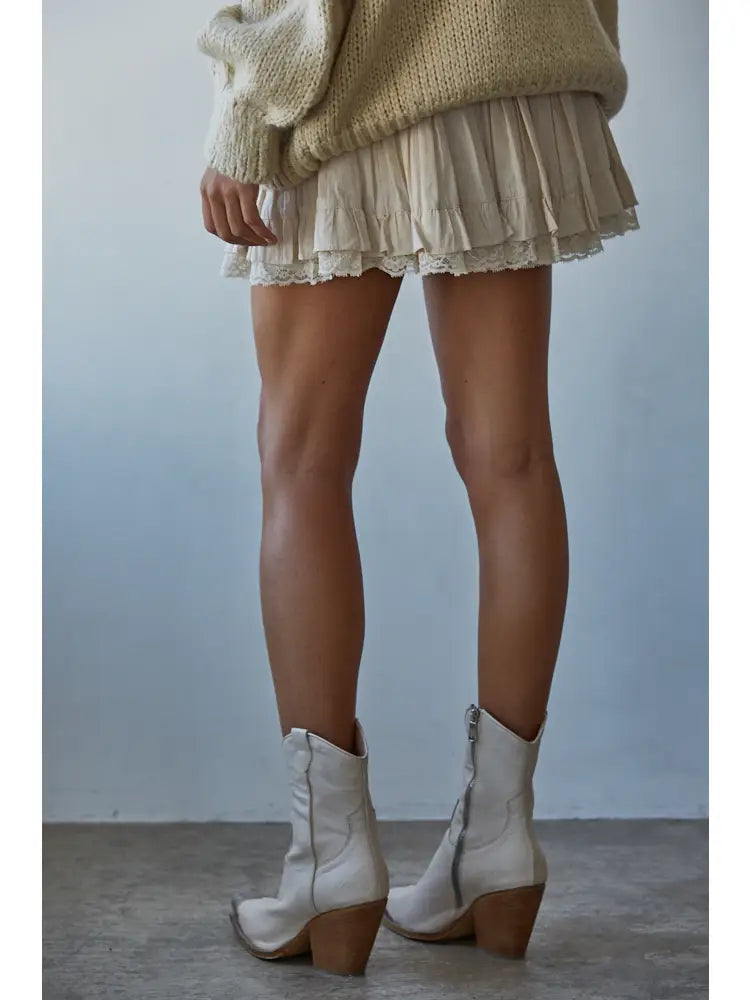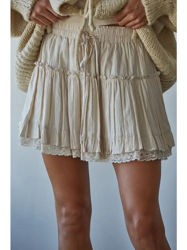 Woven Cotton Tiered Elastic Waist Band Flare Mini Skirt With Waist Tie Strap, Lace Trim Detail And Polyester Spandex Nylon Lining