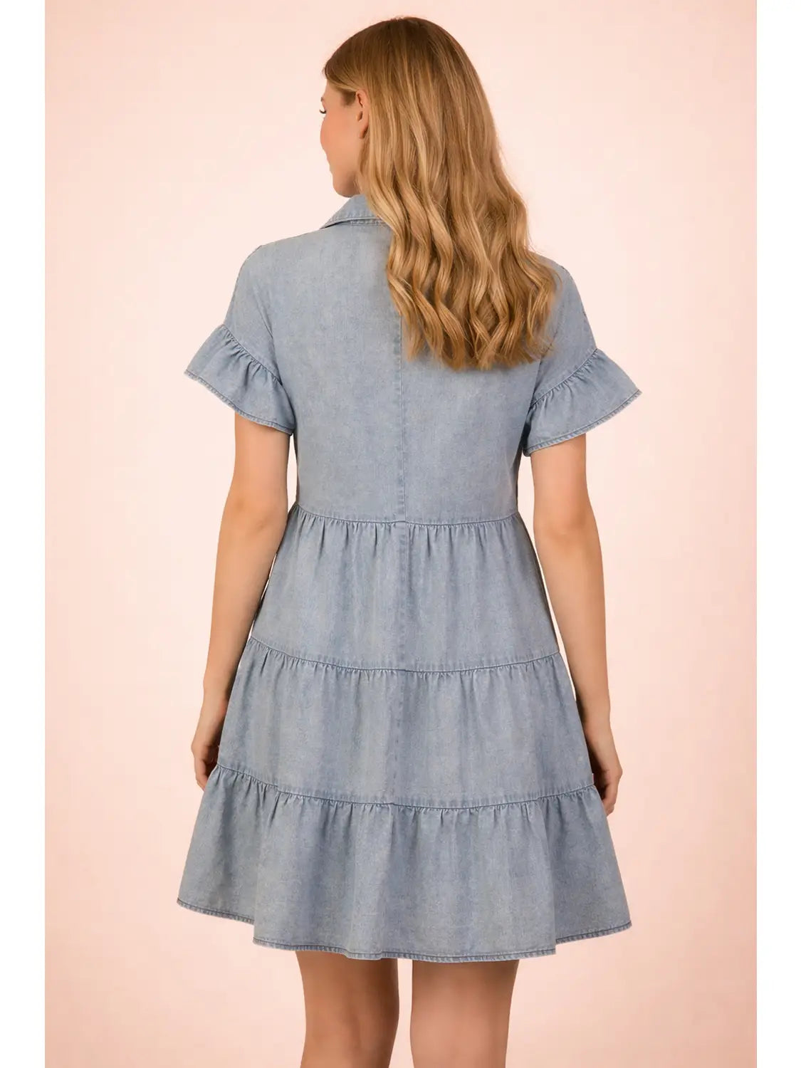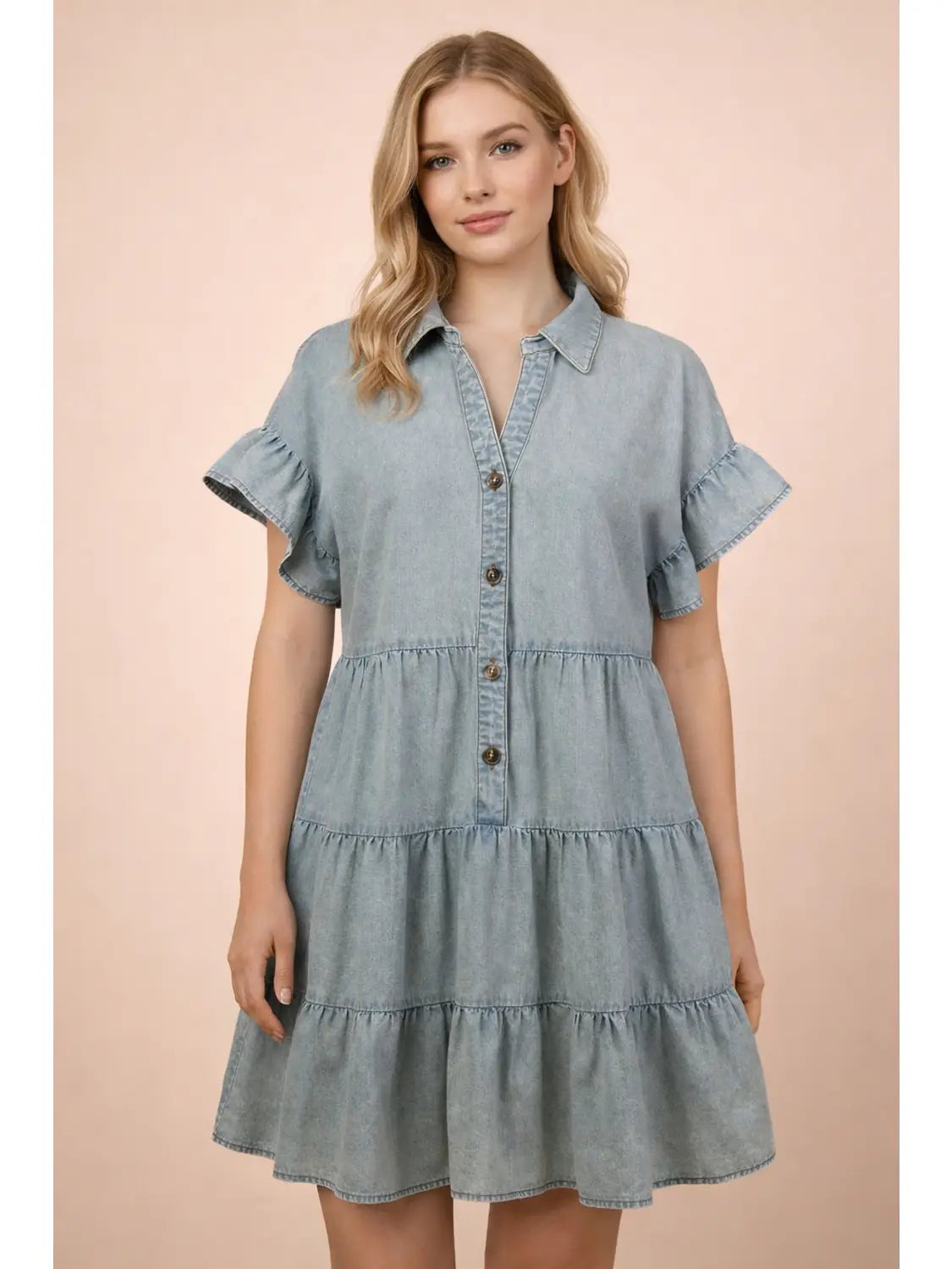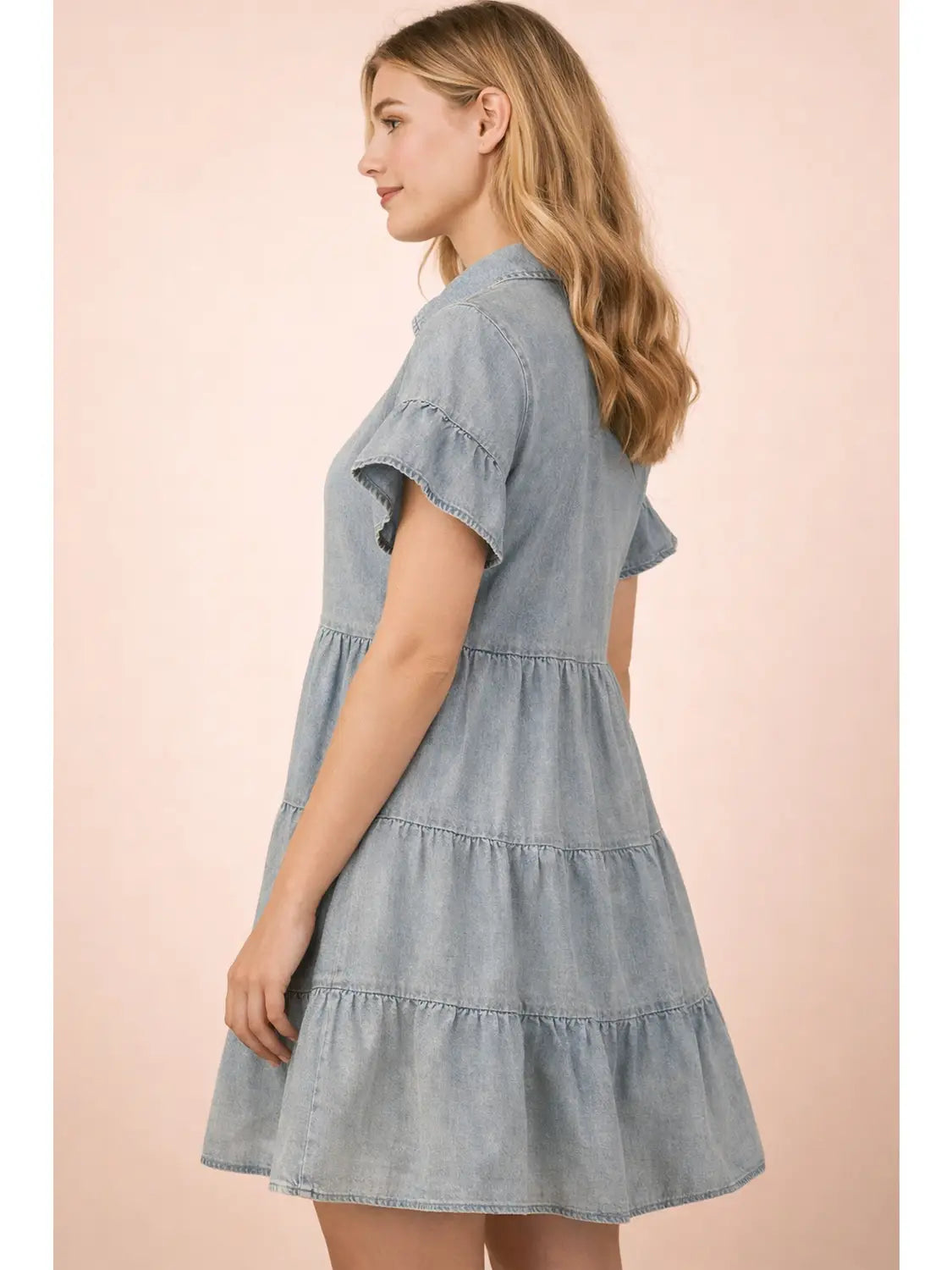 Mineral Washed Chambray Shirt Mini Dress - Half Button Down - Short Ruffle Sleeve - Tiered Layers
