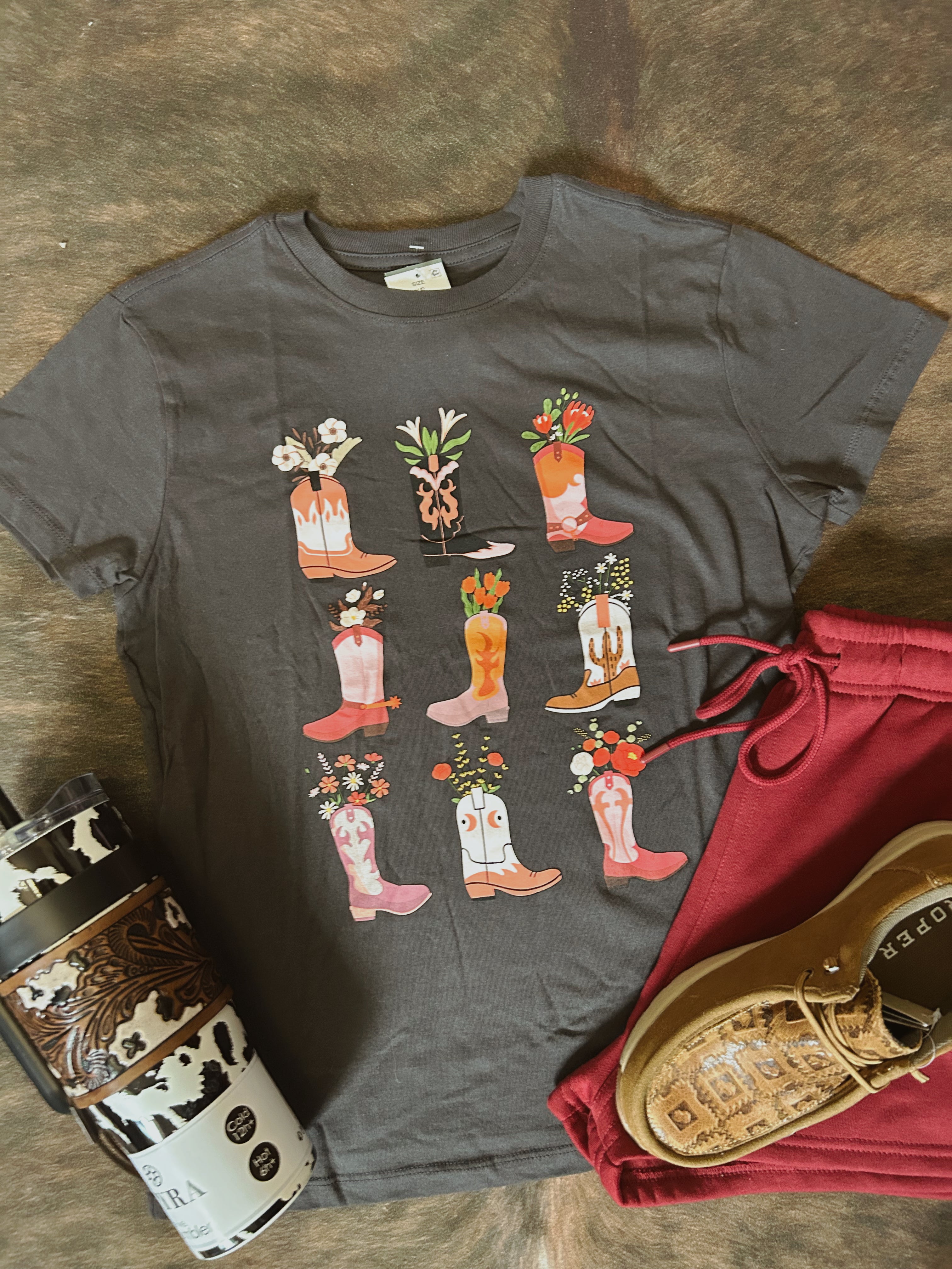 Step into the fun side of western style with the Blooming Boots Tee! Featuring boots bursting with colorful flowers, this playful design adds a fresh twist to your cowboy look. Perfect for those who want to combine rugged charm with a splash of nature’s beauty, this tee brings joy and a touch of whimsy to your everyday outfit. Let your style bloom wherever you go!