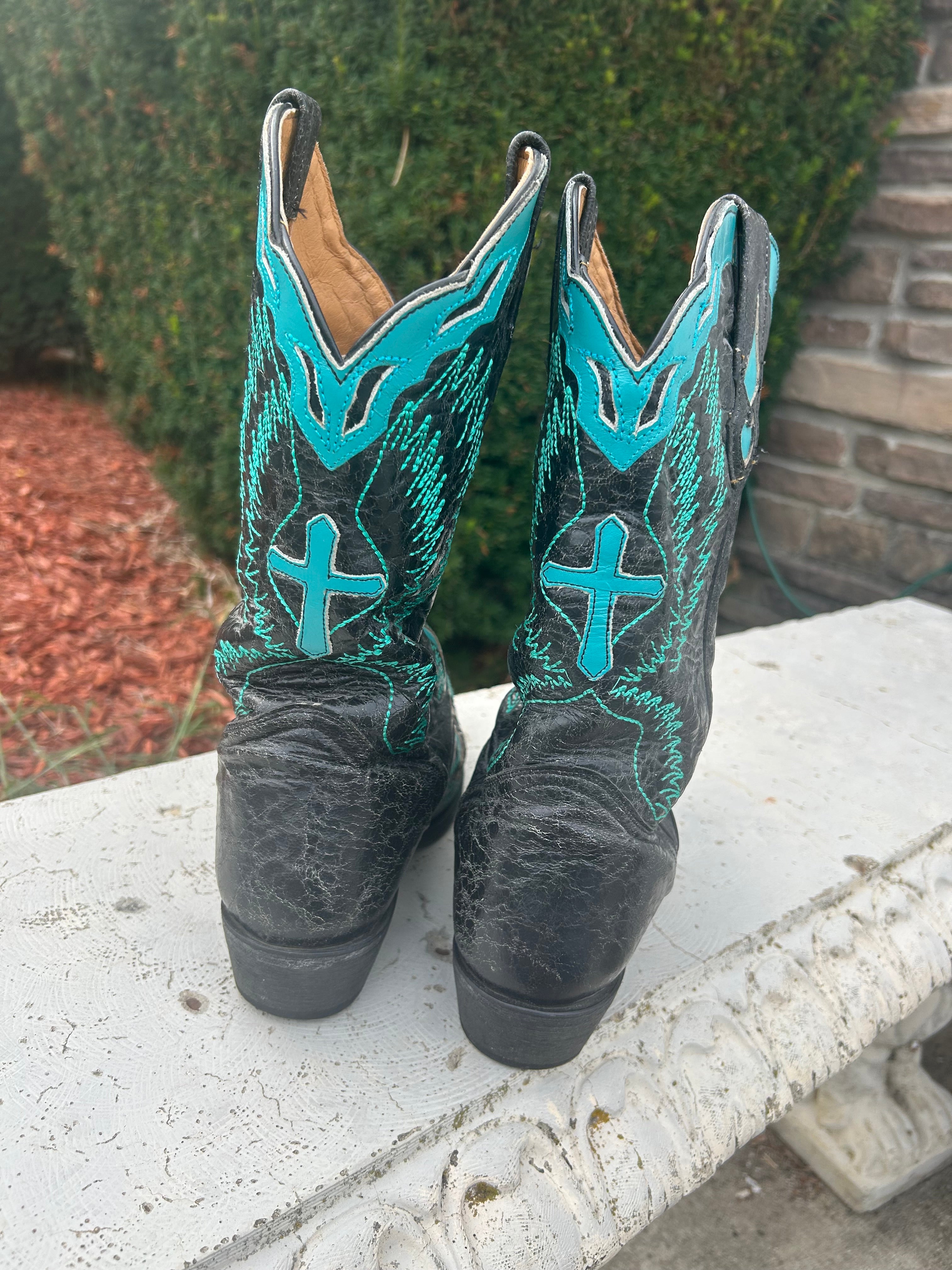 Step into bold style with the J.B. Dillion Cowgirl boots. Featuring a striking turquoise cross design against sleek black leather, these boots bring a pop of color and personality to your look. Perfect for adding a playful twist to your cowgirl vibe, they combine eye-catching detail with classic western flair. Ready to turn heads wherever you ride or roam!