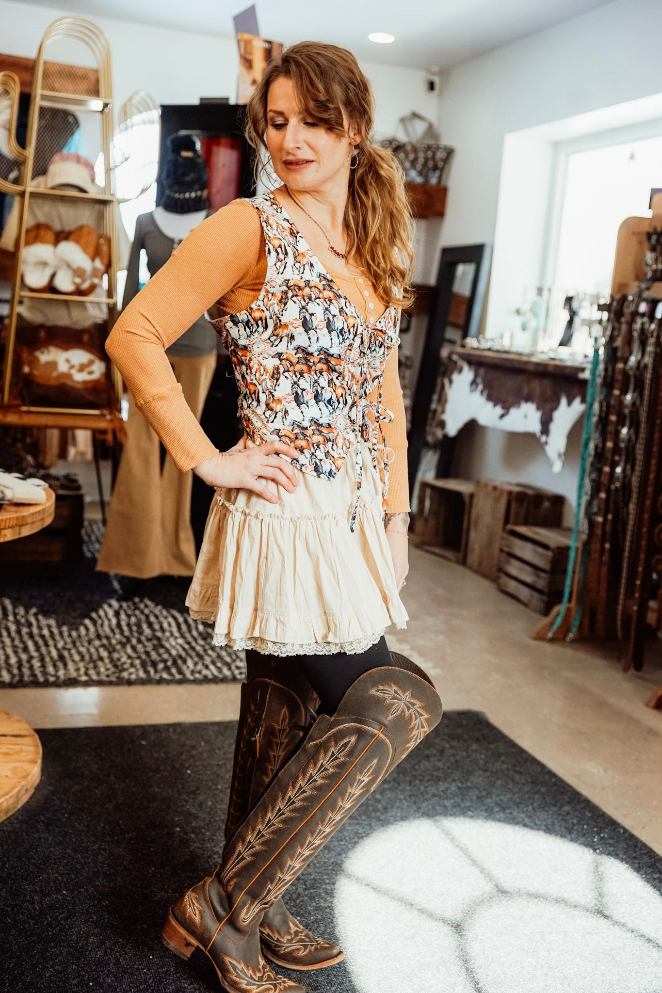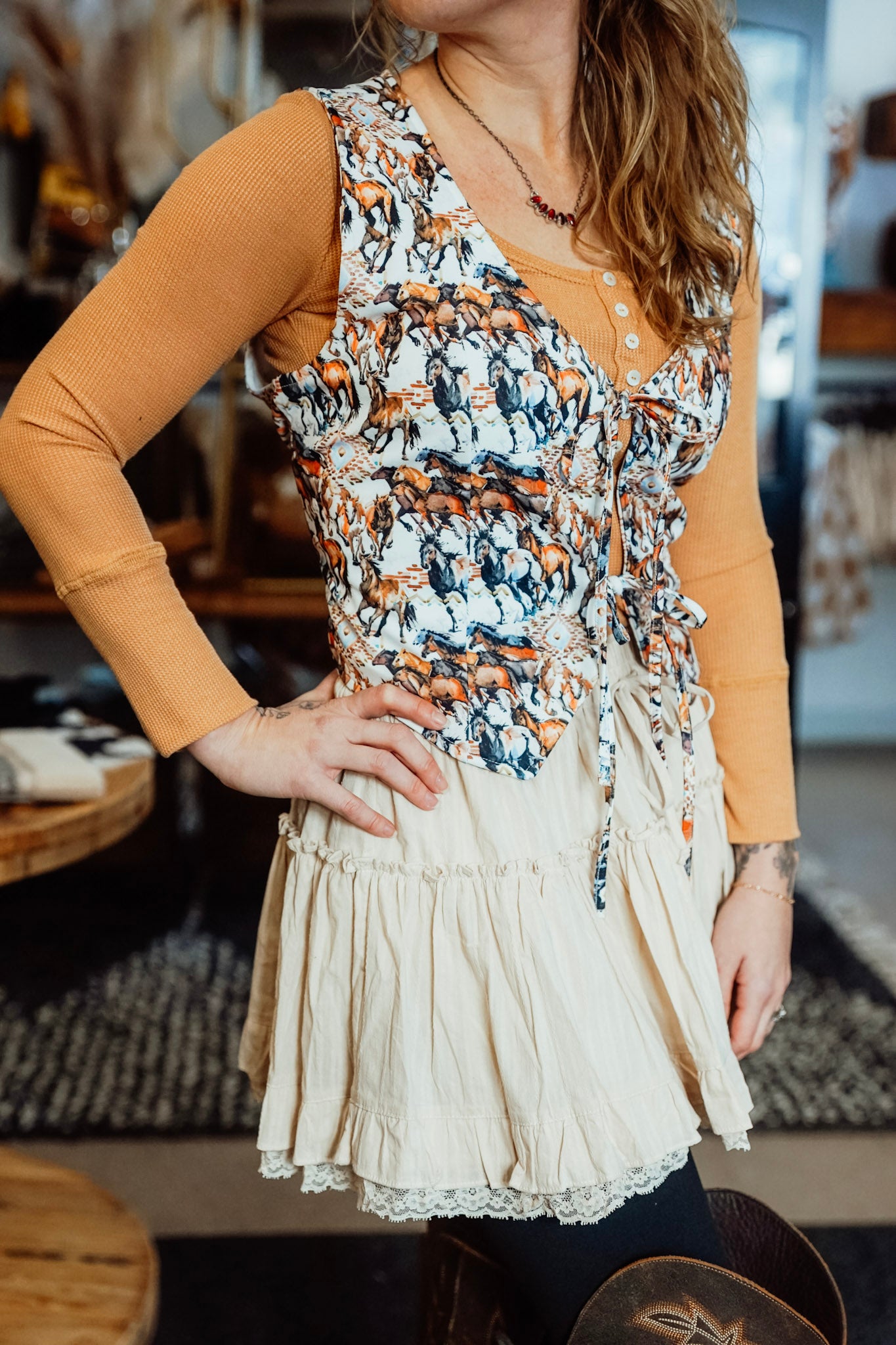 Introducing the Buckaroo Front Tie Vest, a luxurious and sophisticated addition to your wardrobe. Crafted with a front tie design inspired by the grace and strength of horses, this vest adds an elegant touch to any outfit. Embrace the exclusivity and artistry of this piece, and elevate your style with ease.