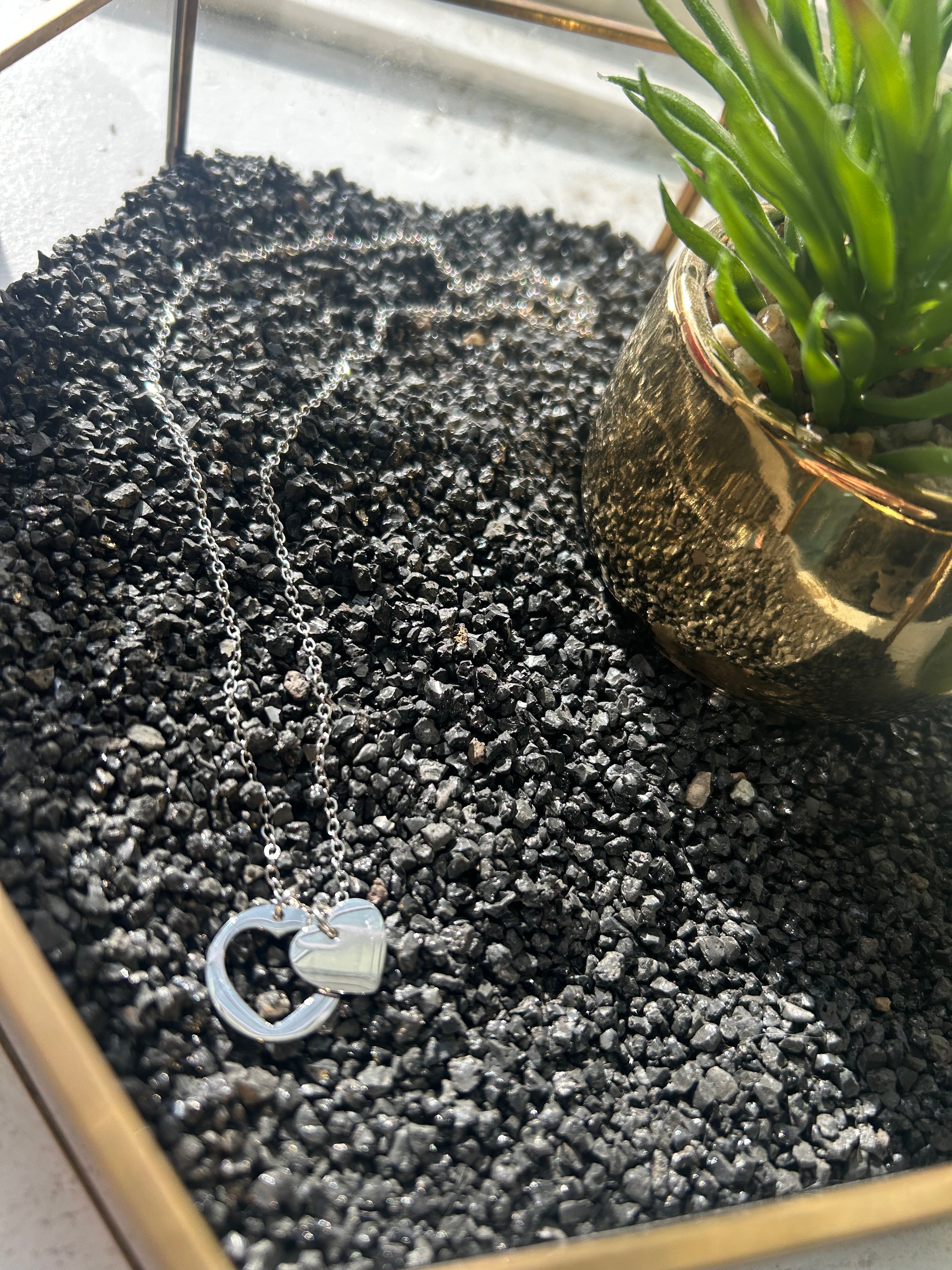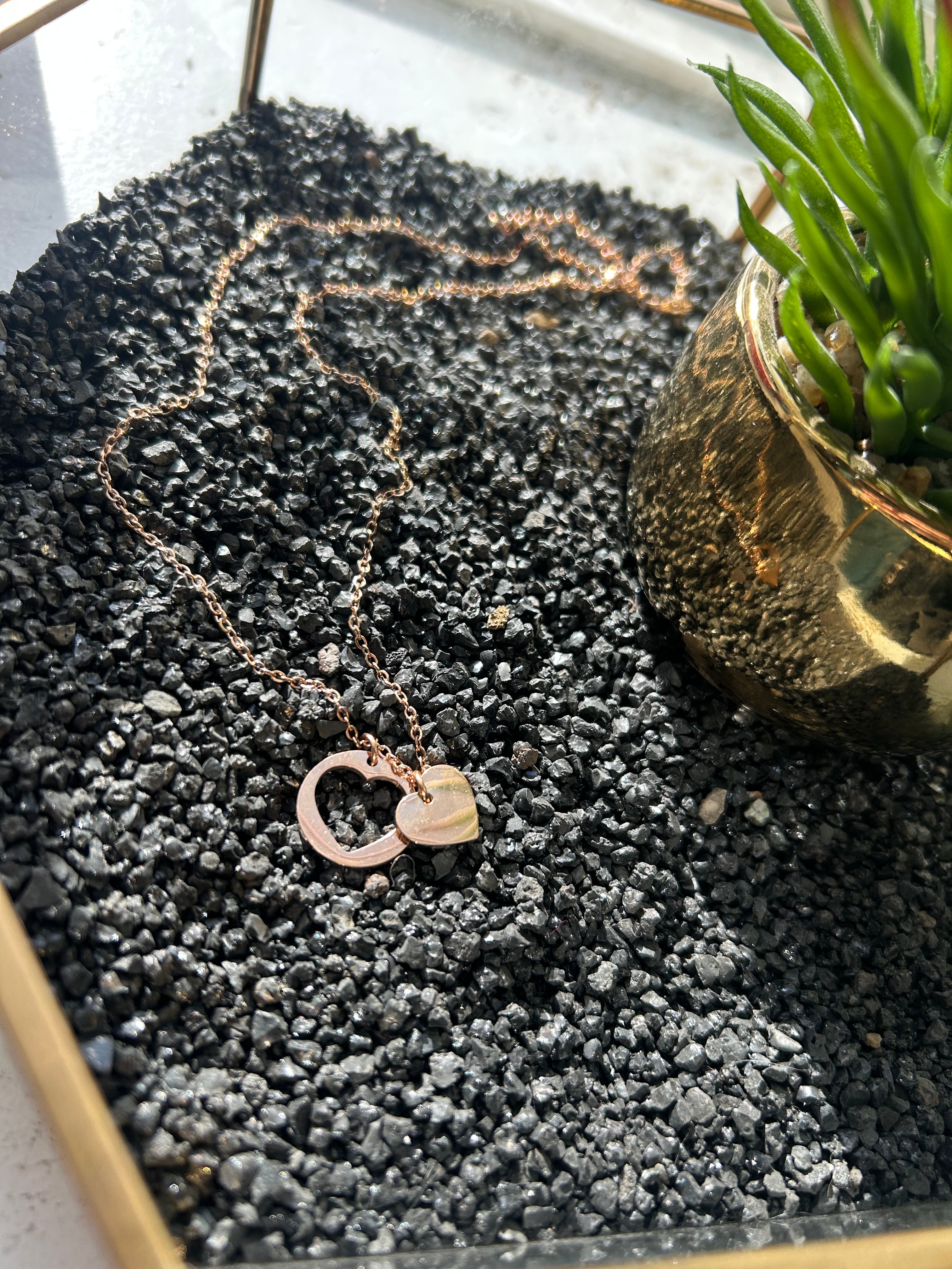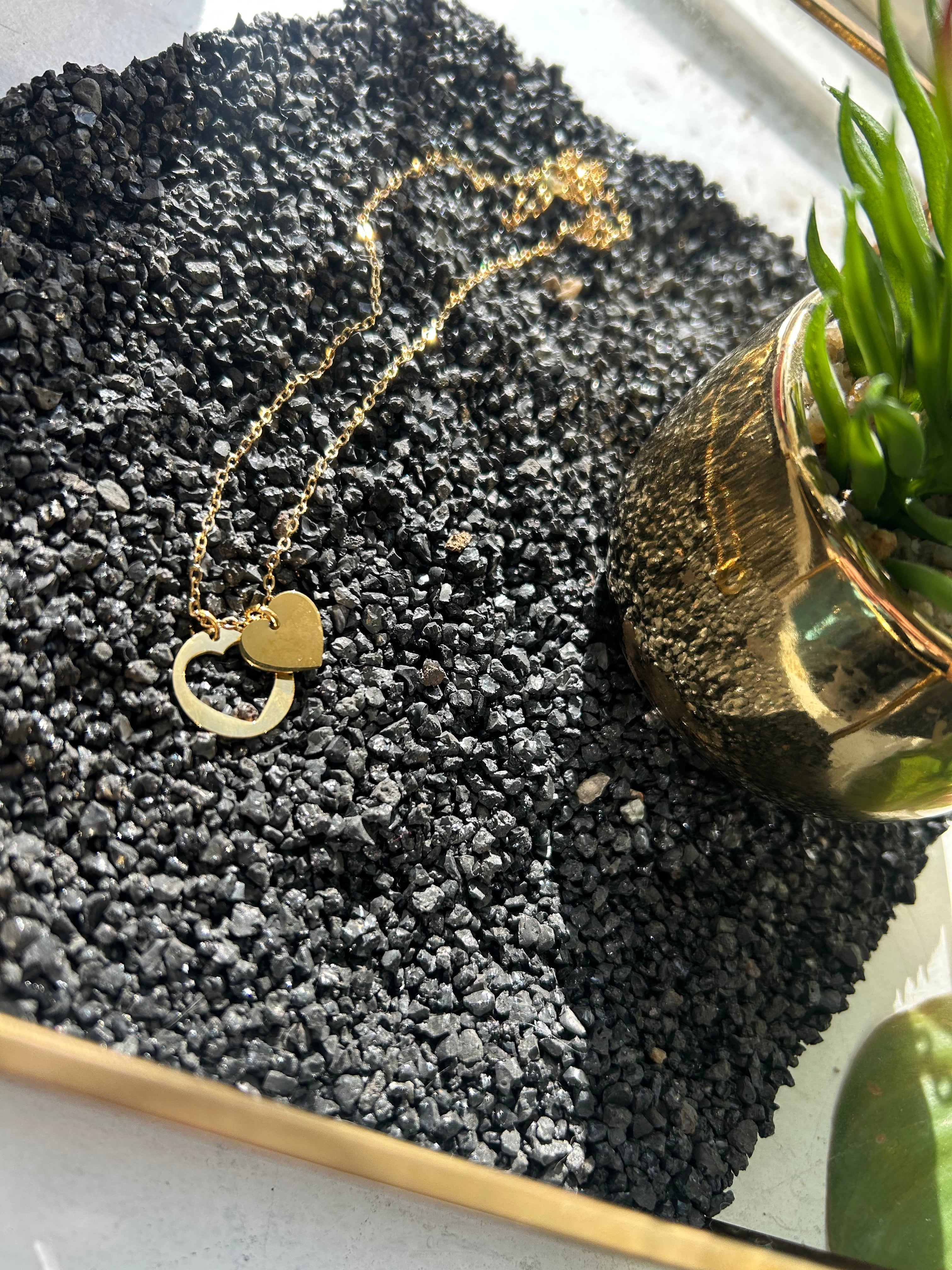 he perfect play on positive and negative design. This timeless 13mm pendant features a cut out in the shape of a heart and a matching metal charm. Both pieces are featured on a 18" loop chain with a 2" extender Made with the highest grade of hypoallergenic 316L surgical grade stainless steel, and the 18K Gold and 18k Rose Gold styles are PVD coated for a lasting and beautiful finish._x000D_