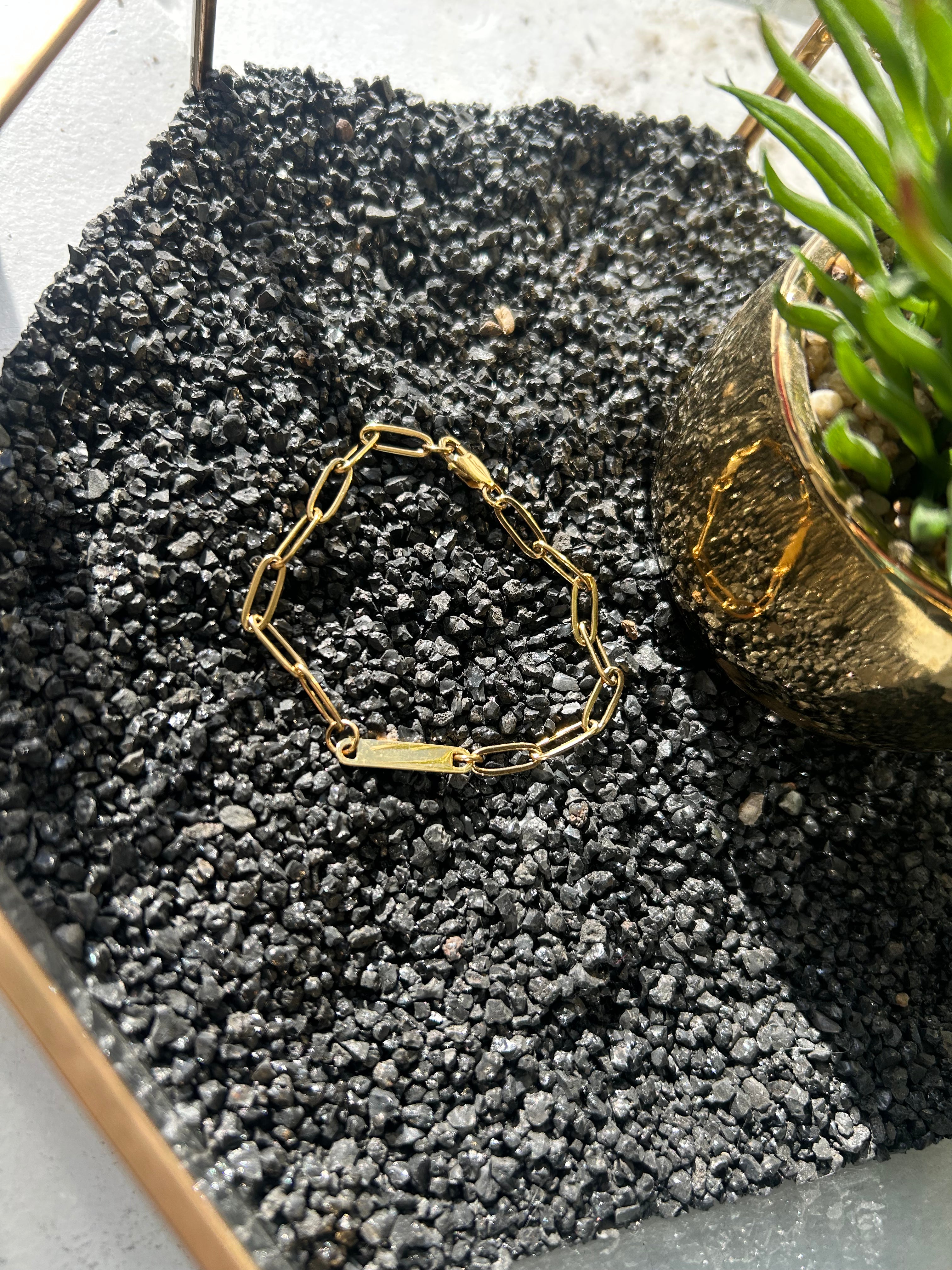 This captivating style skillfully combines the fashionable 18K Gold PVD Coated Paperclip Chain with an engravable rectangle bar, allowing patrons to customize their bracelet to reflect the modern trend._x000D_