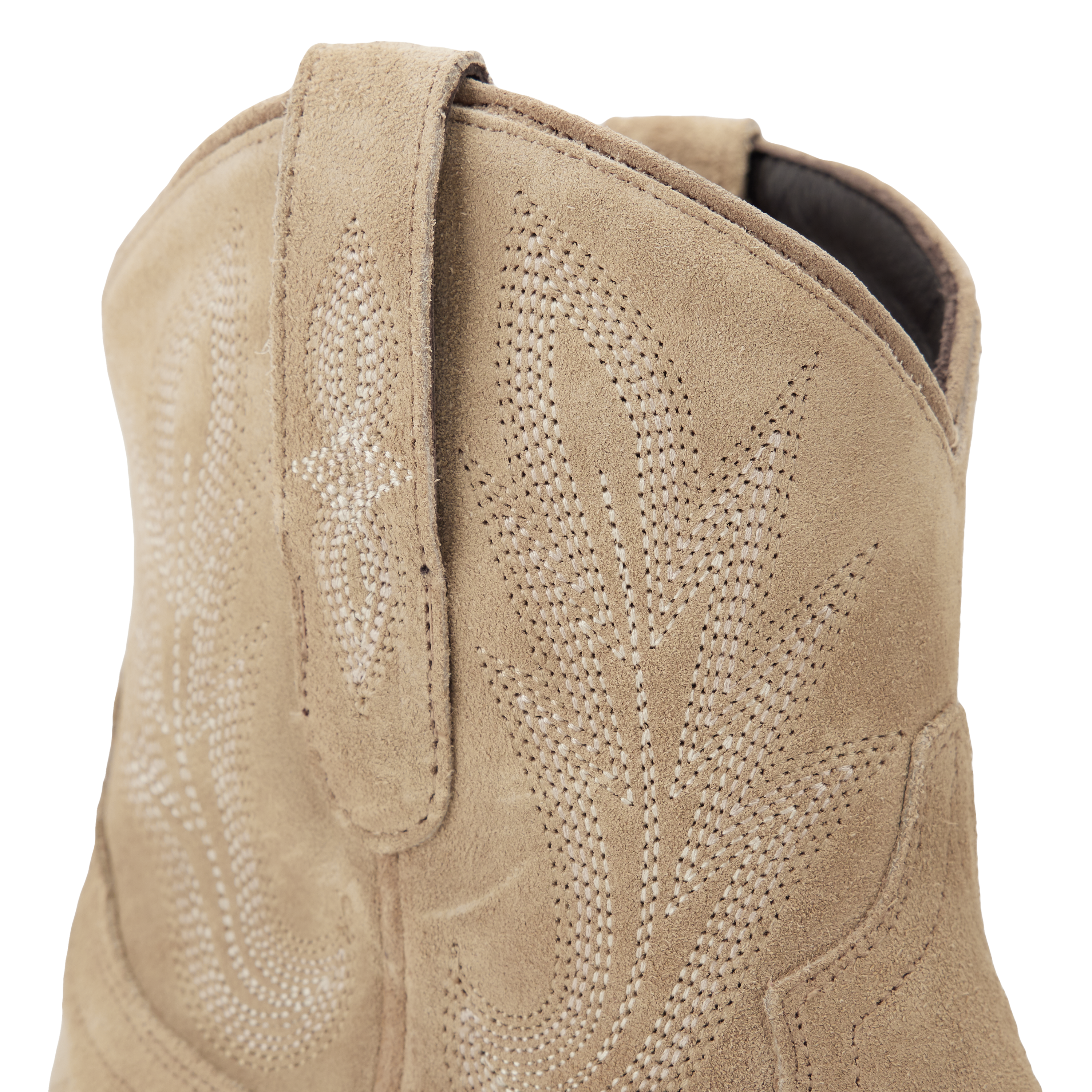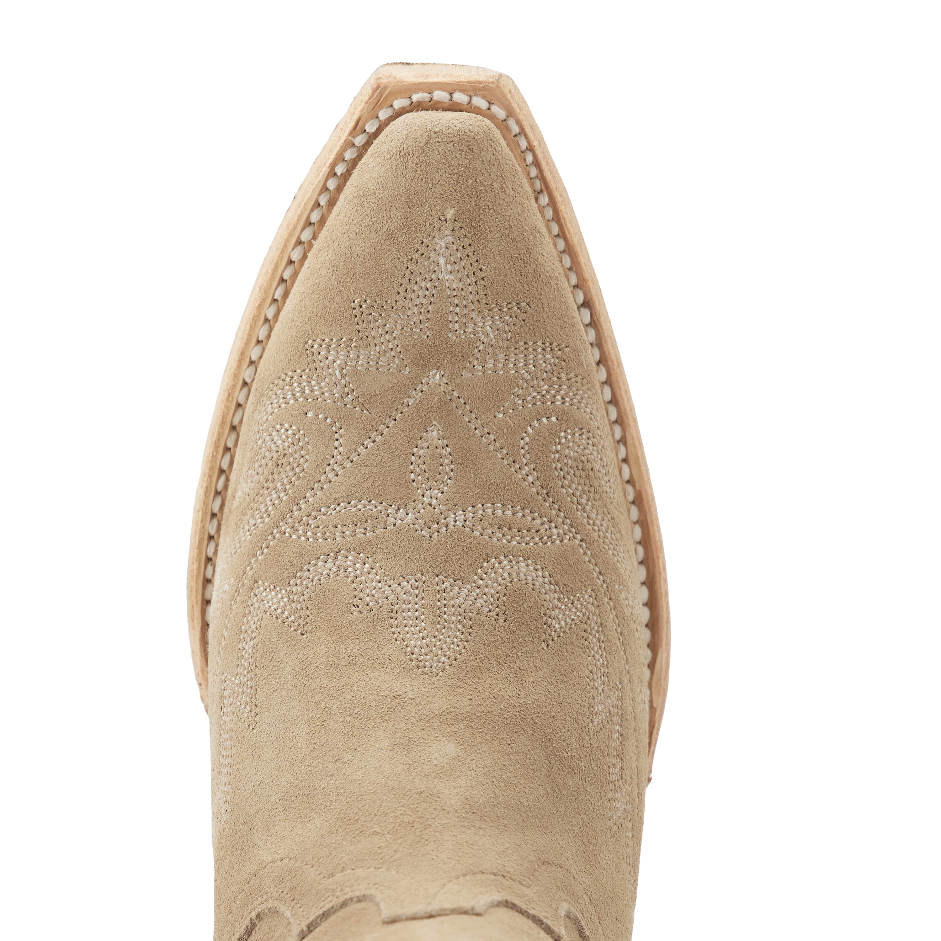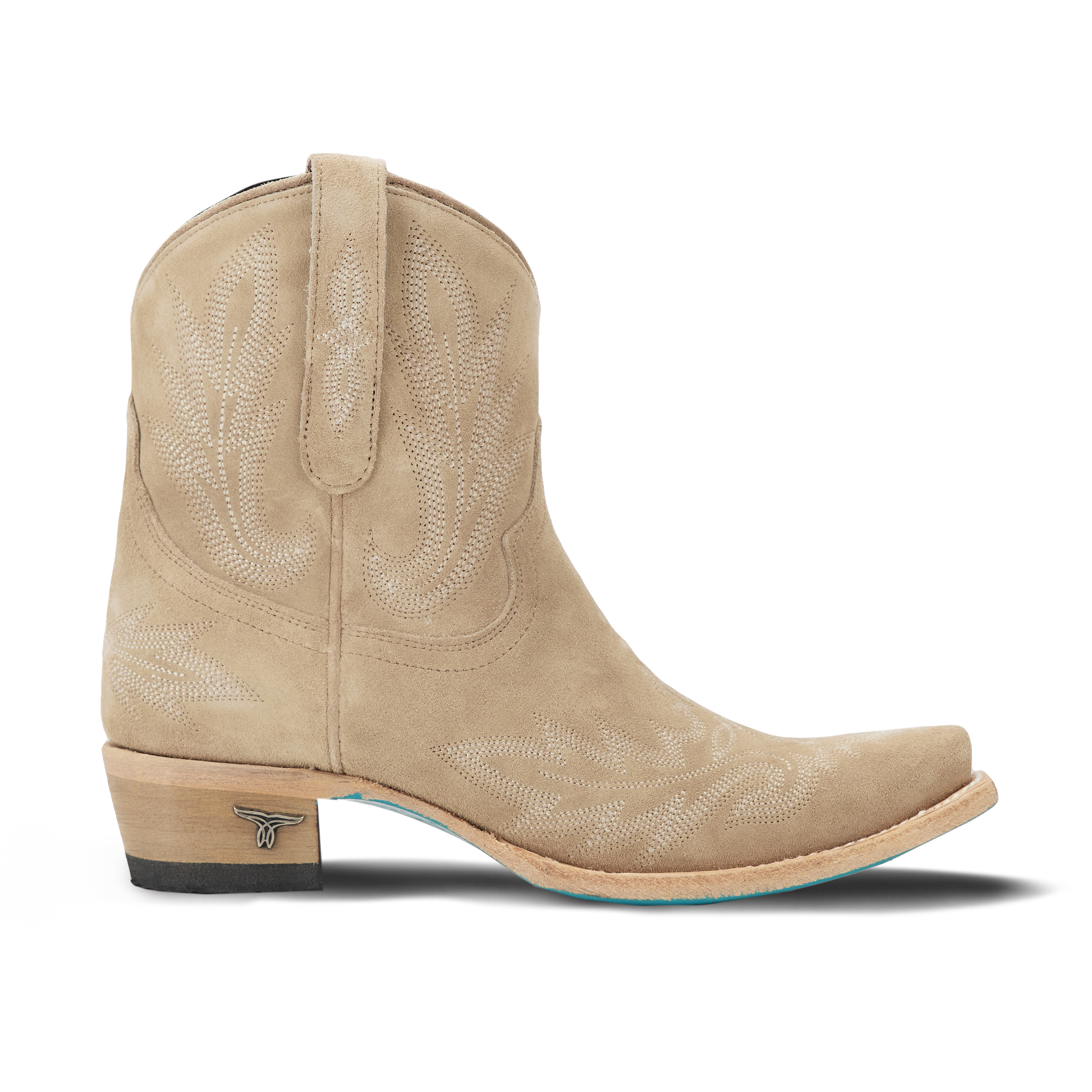 Heirloom quality ankle boots with a western influence. The classic snip toe profile is embroidered to perfection with a twist on traditional flame stitch in bootie form. She's short, sweet, and just the right height to pair well with your wardrobe.