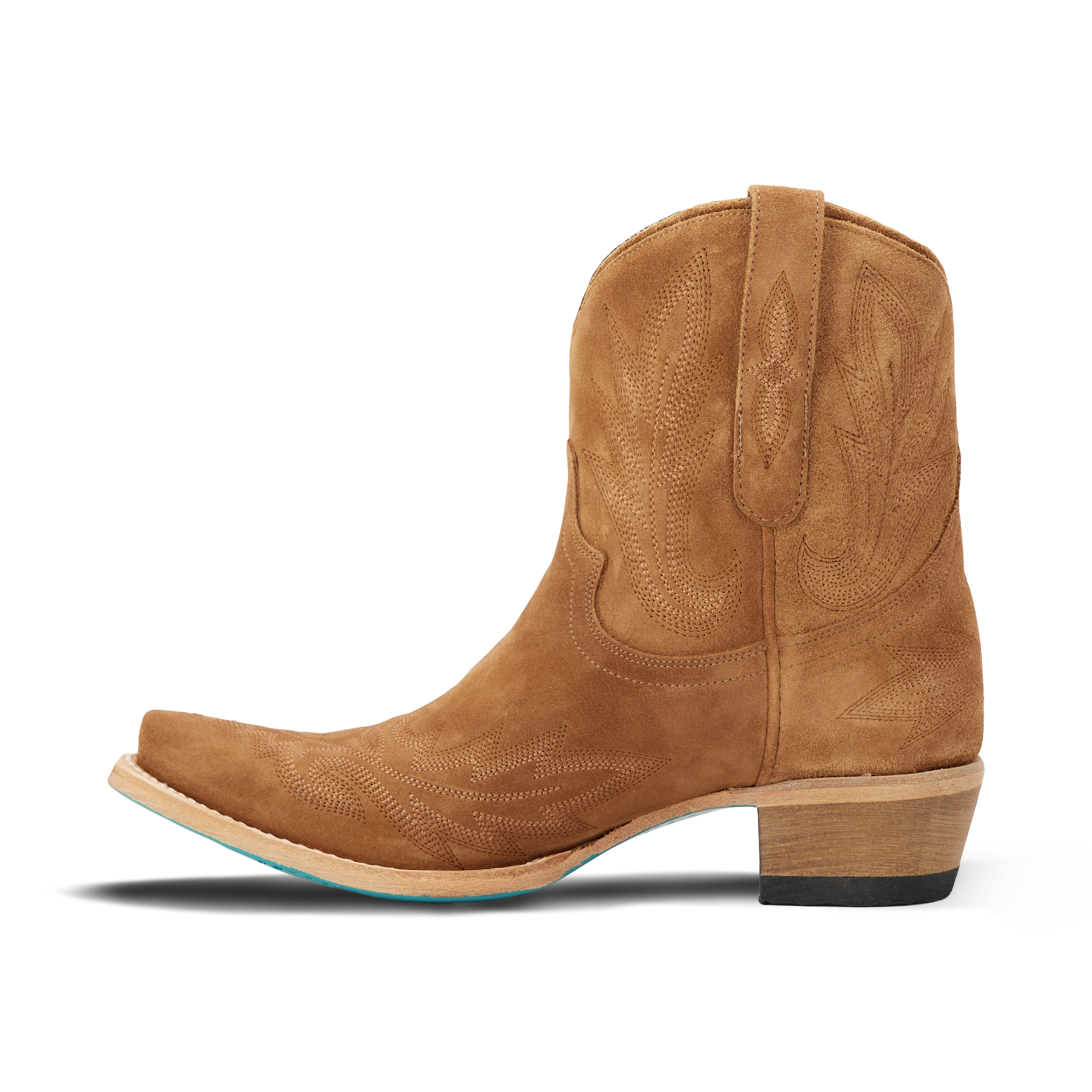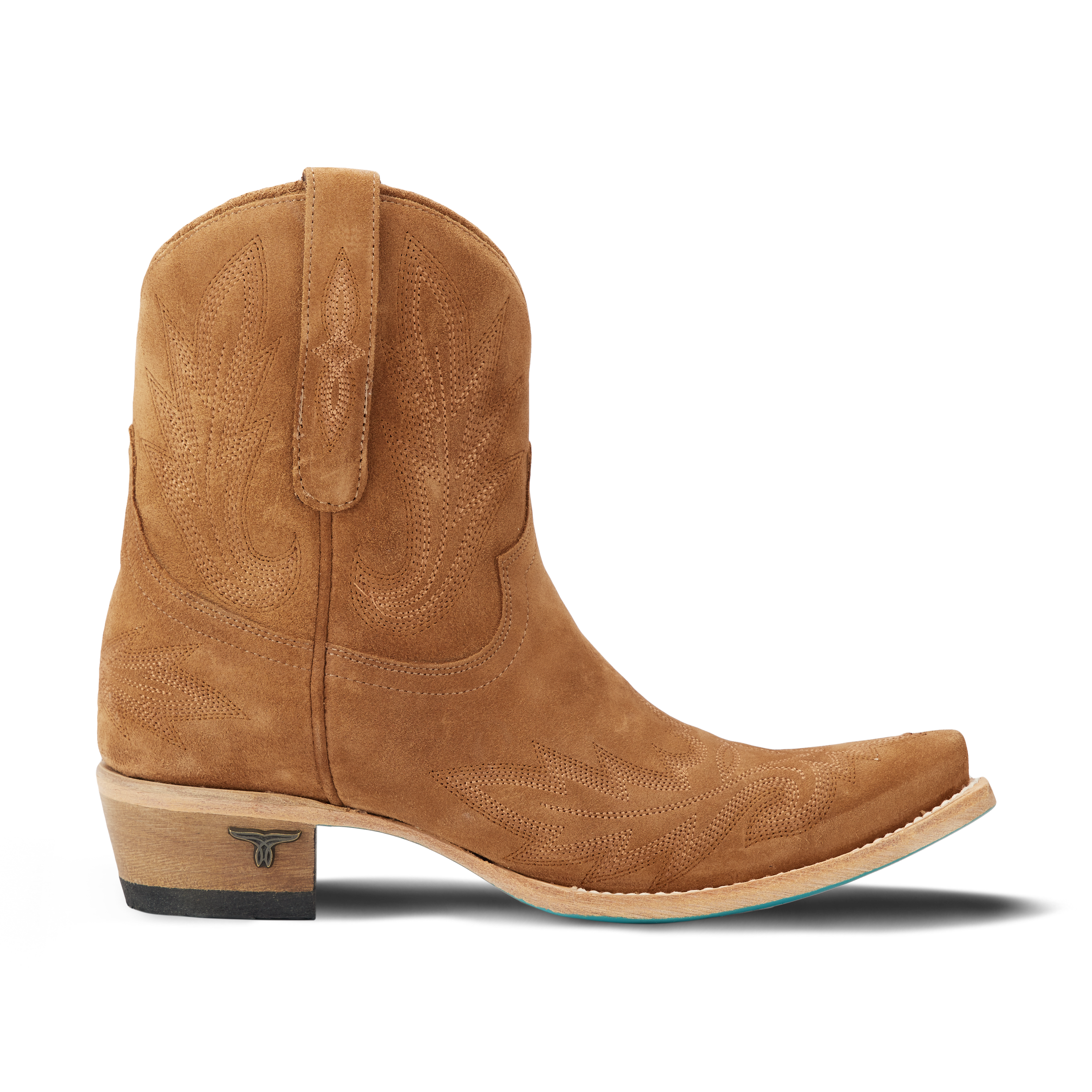 Heirloom quality ankle boots with a western influence. The classic snip toe profile is embroidered to perfection with a twist on traditional flame stitch in bootie form. She's short, sweet, and just the right height to pair well with your wardrobe.