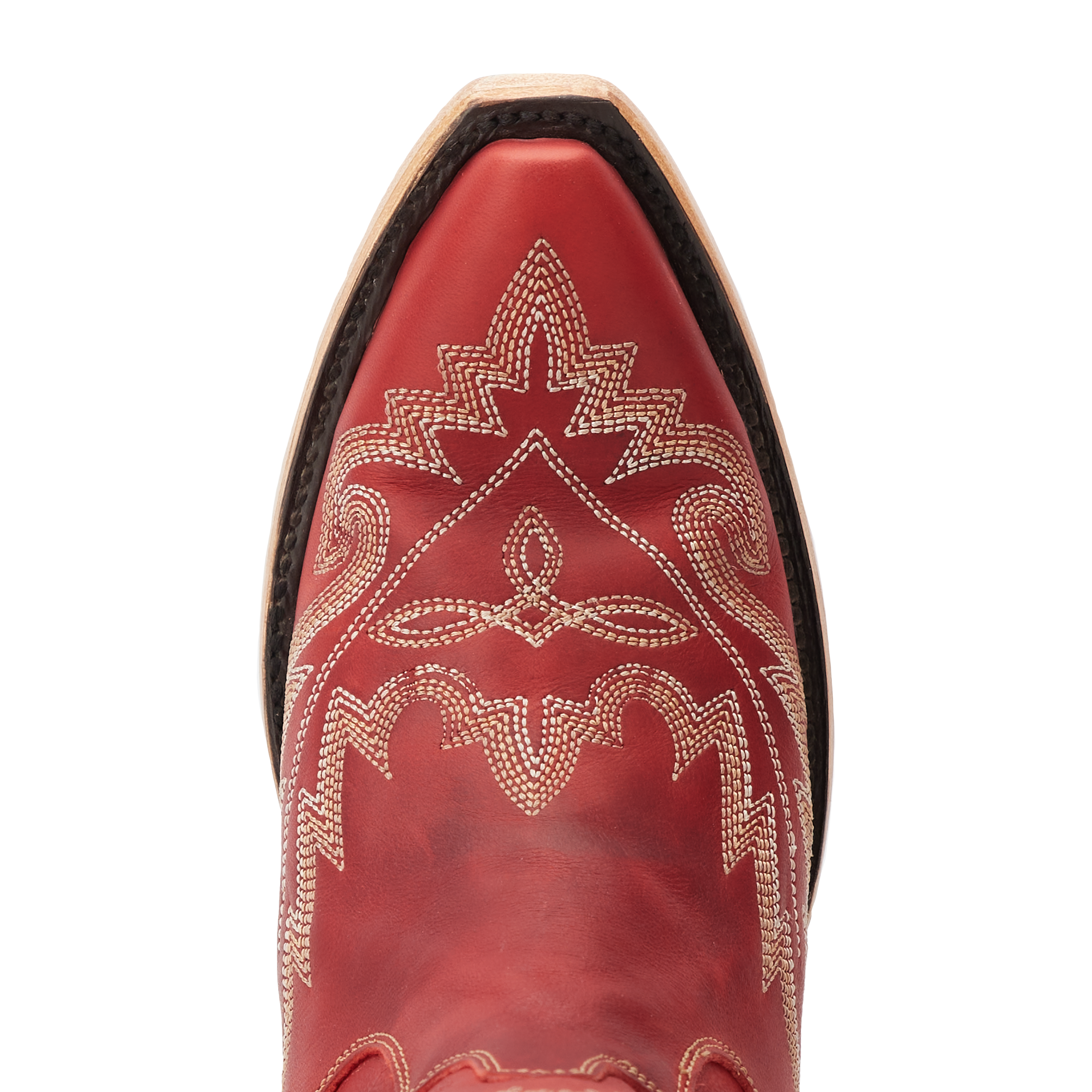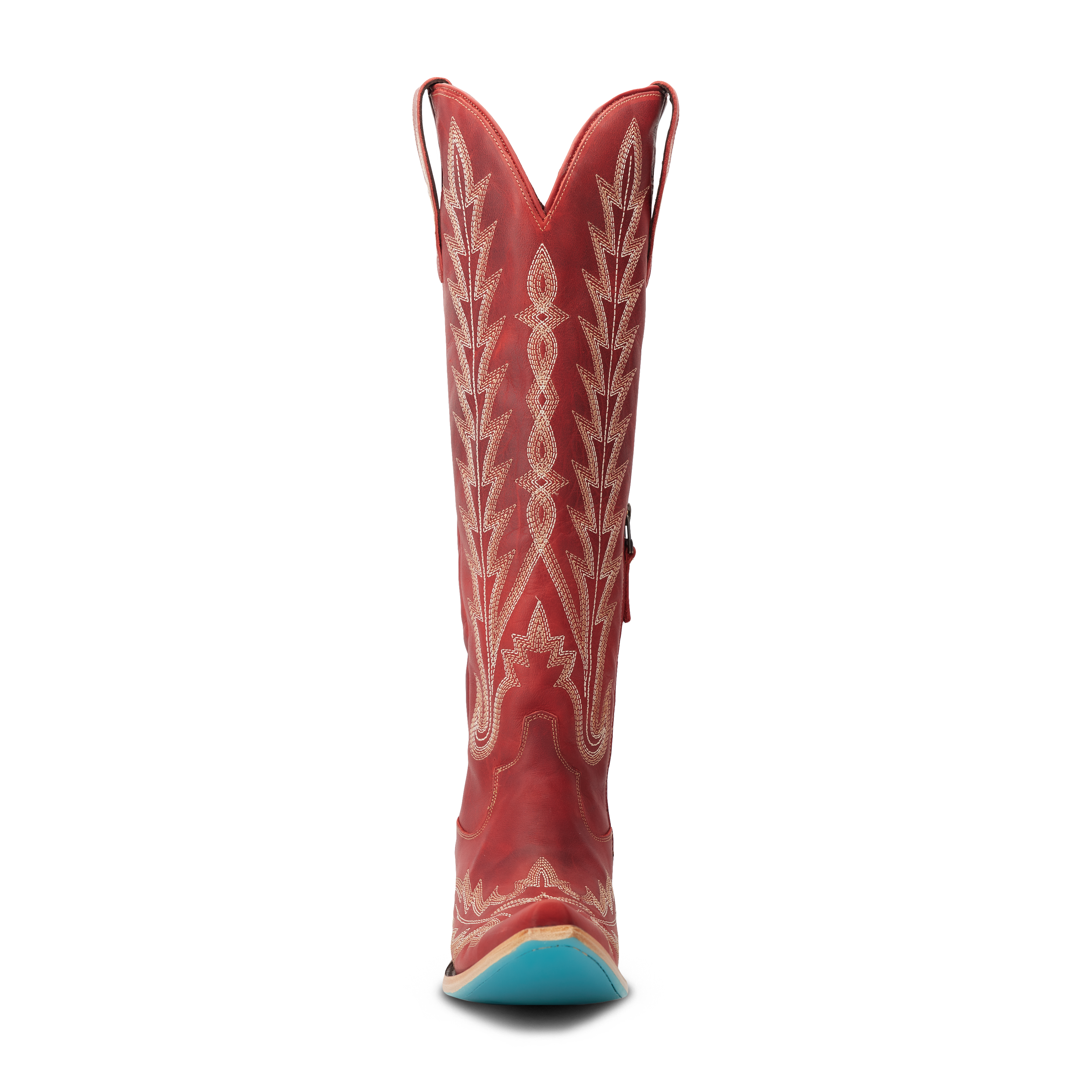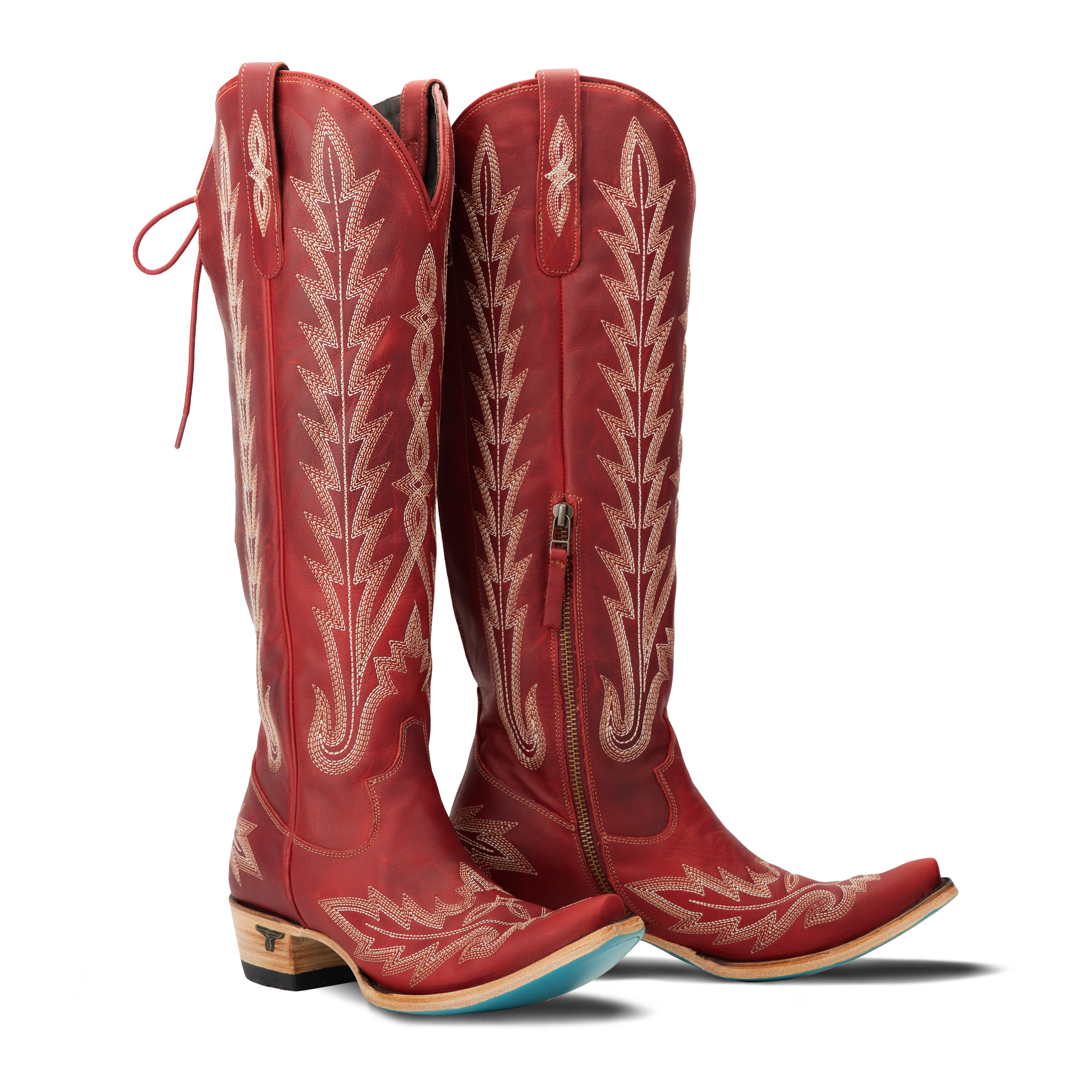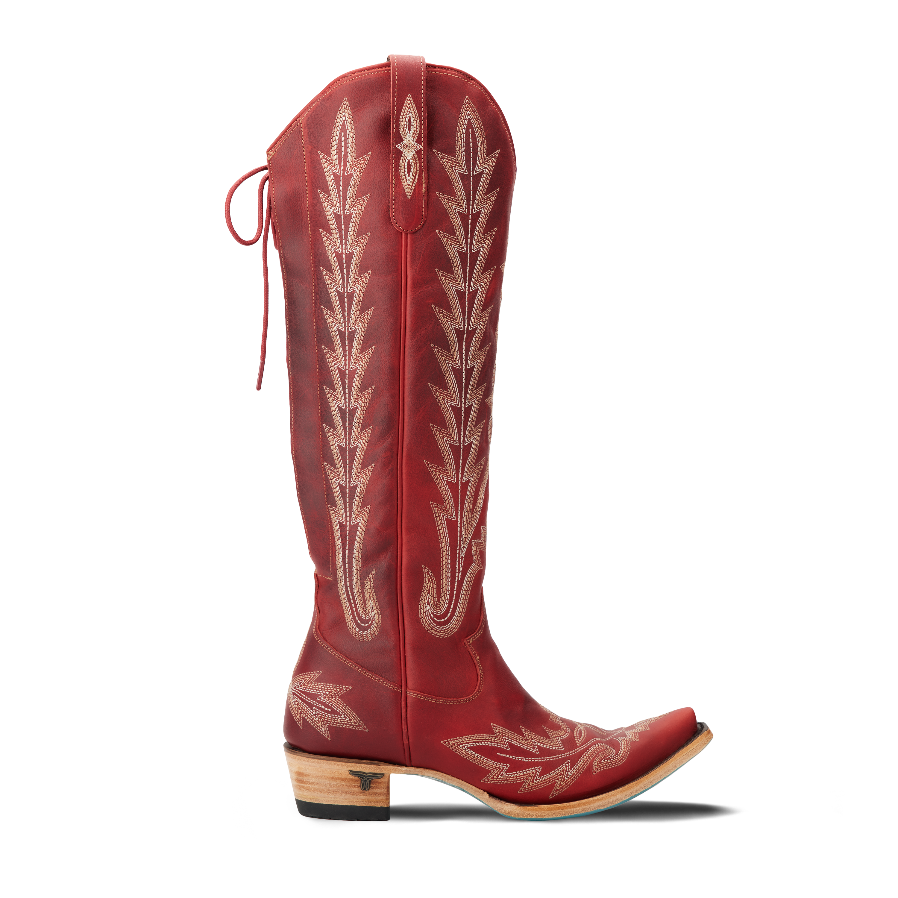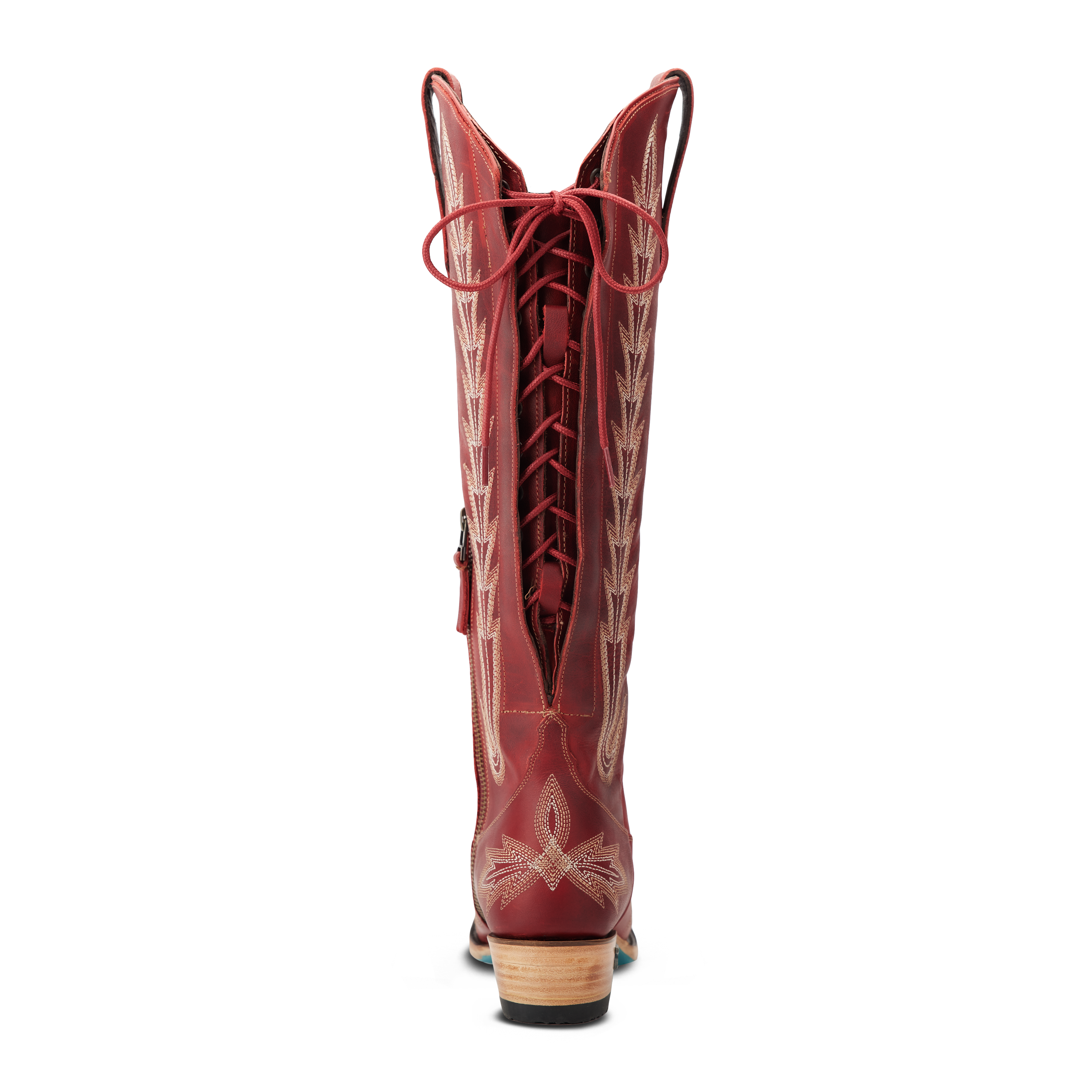 Heirloom quality with a core western influence. The classic snip toe profile is embroidered to perfection with a twist on traditional flame stitch and a functional corset back. The Lexington Knee-High is timeless and sexy all wrapped in one.