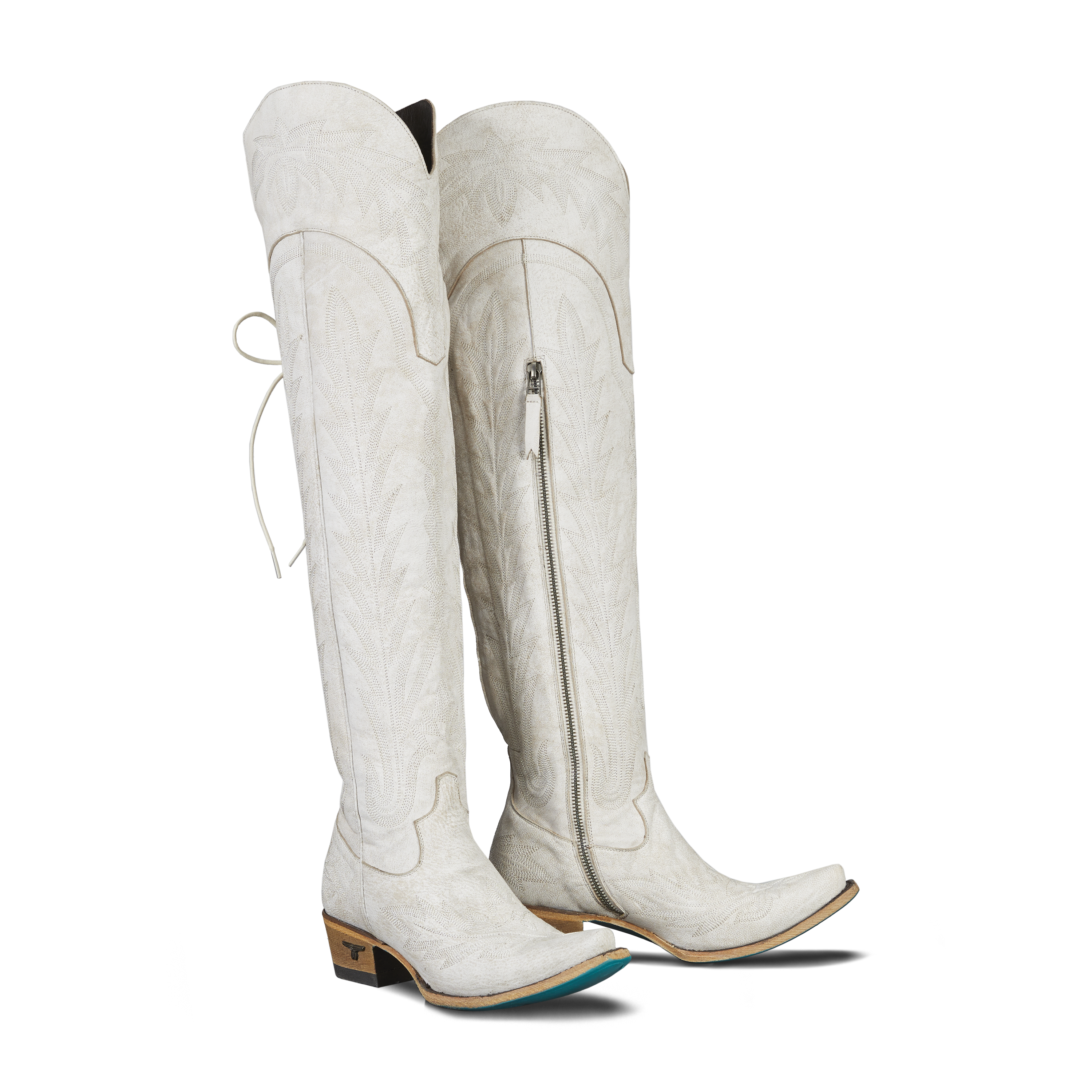 Sexy Over the Knee boot kicking classic retro stitch up all the notches.  Functional corset with wide tongue to accommodate all sexy leg types. Customize the corset to your leg one time and the easy in, easy out zipper will take care of the rest.