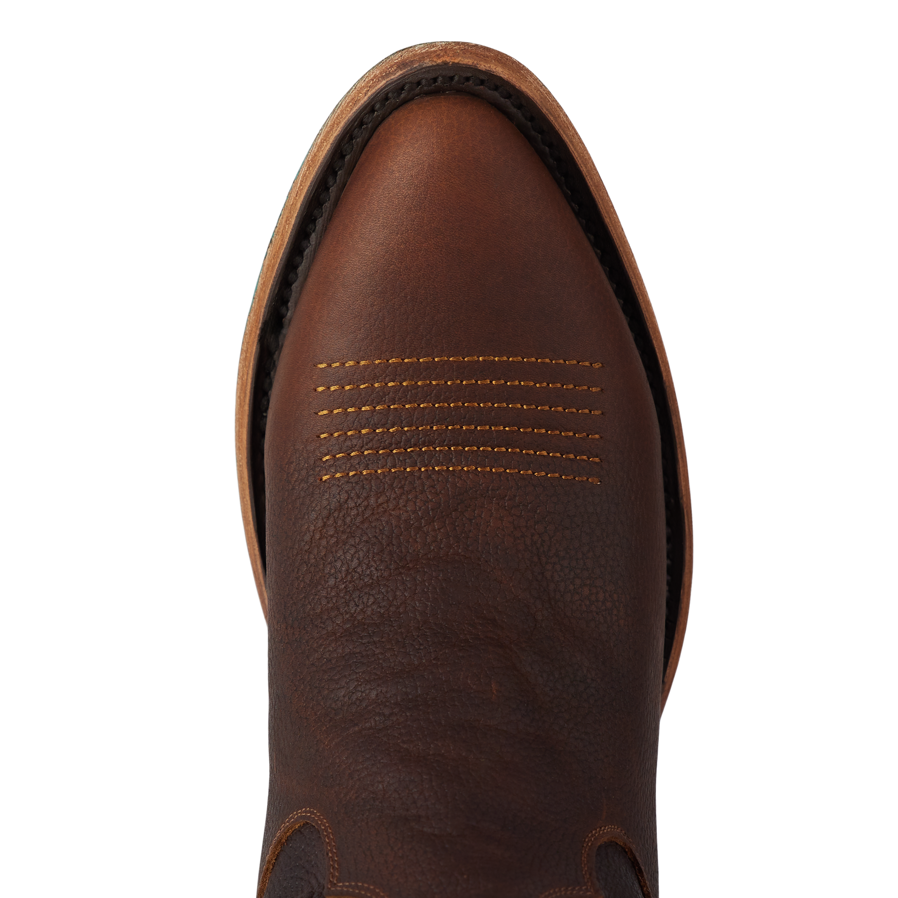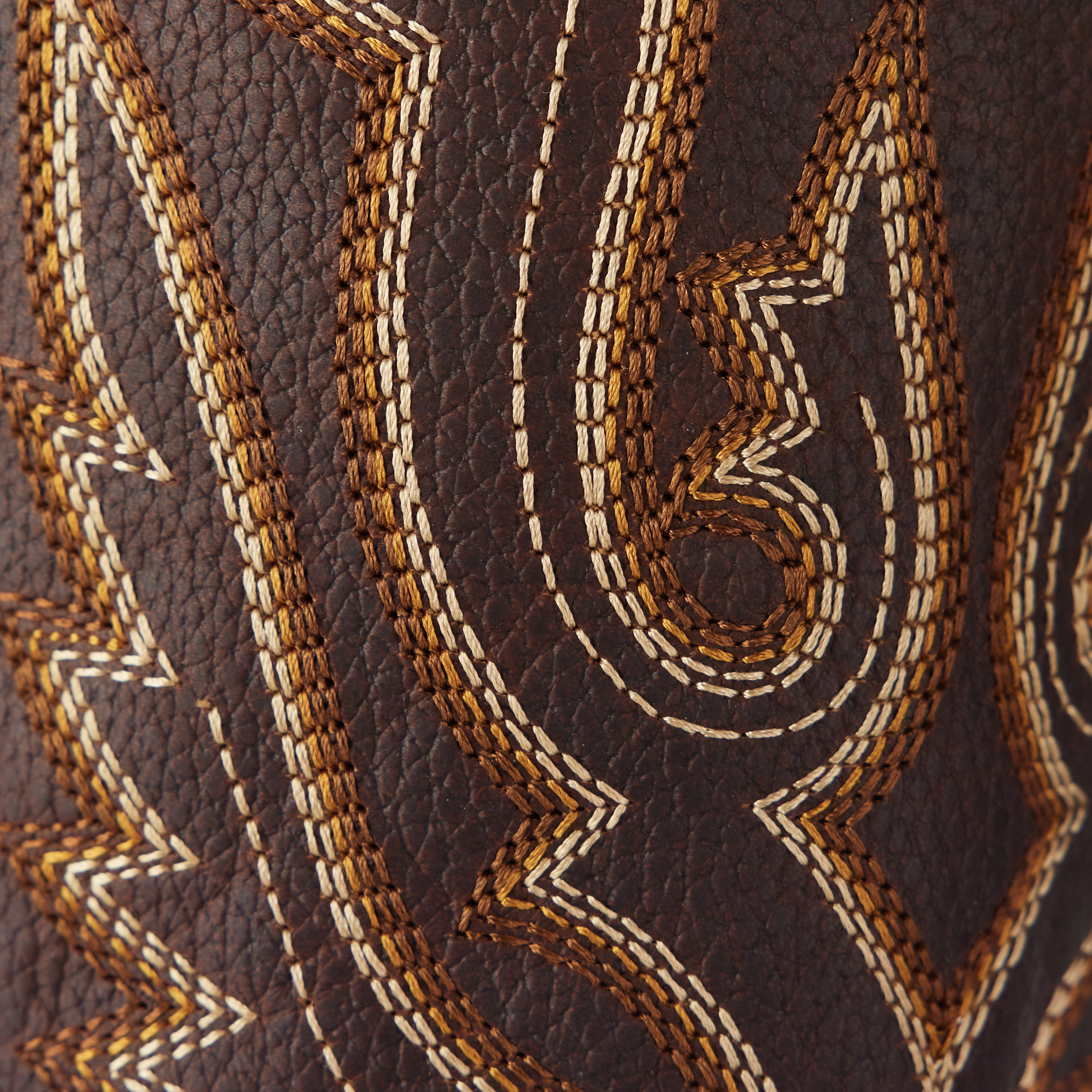 Heirloom quality with a core western influence. The classic snip toe profile is embroidered to perfection with a twist on traditional flame stitch and a functional corset back.