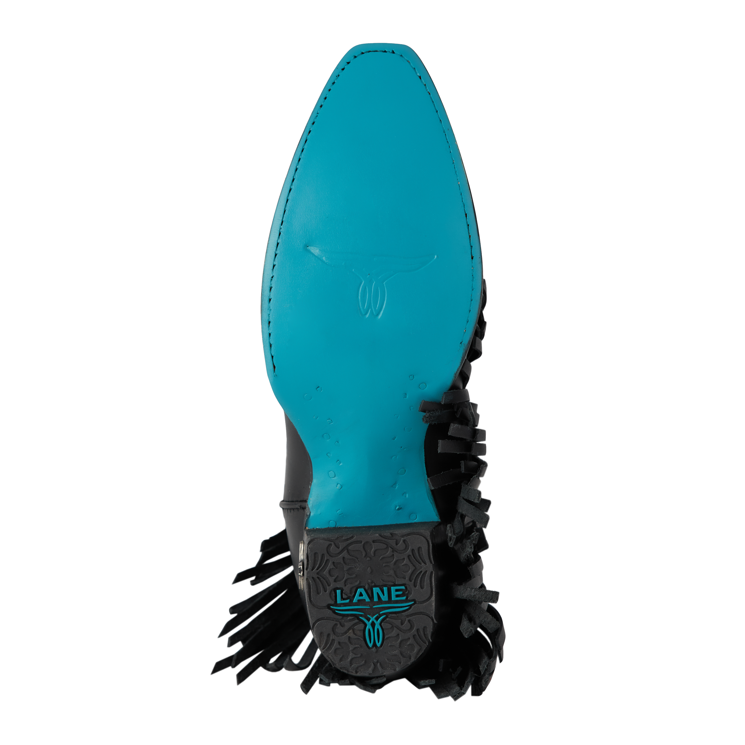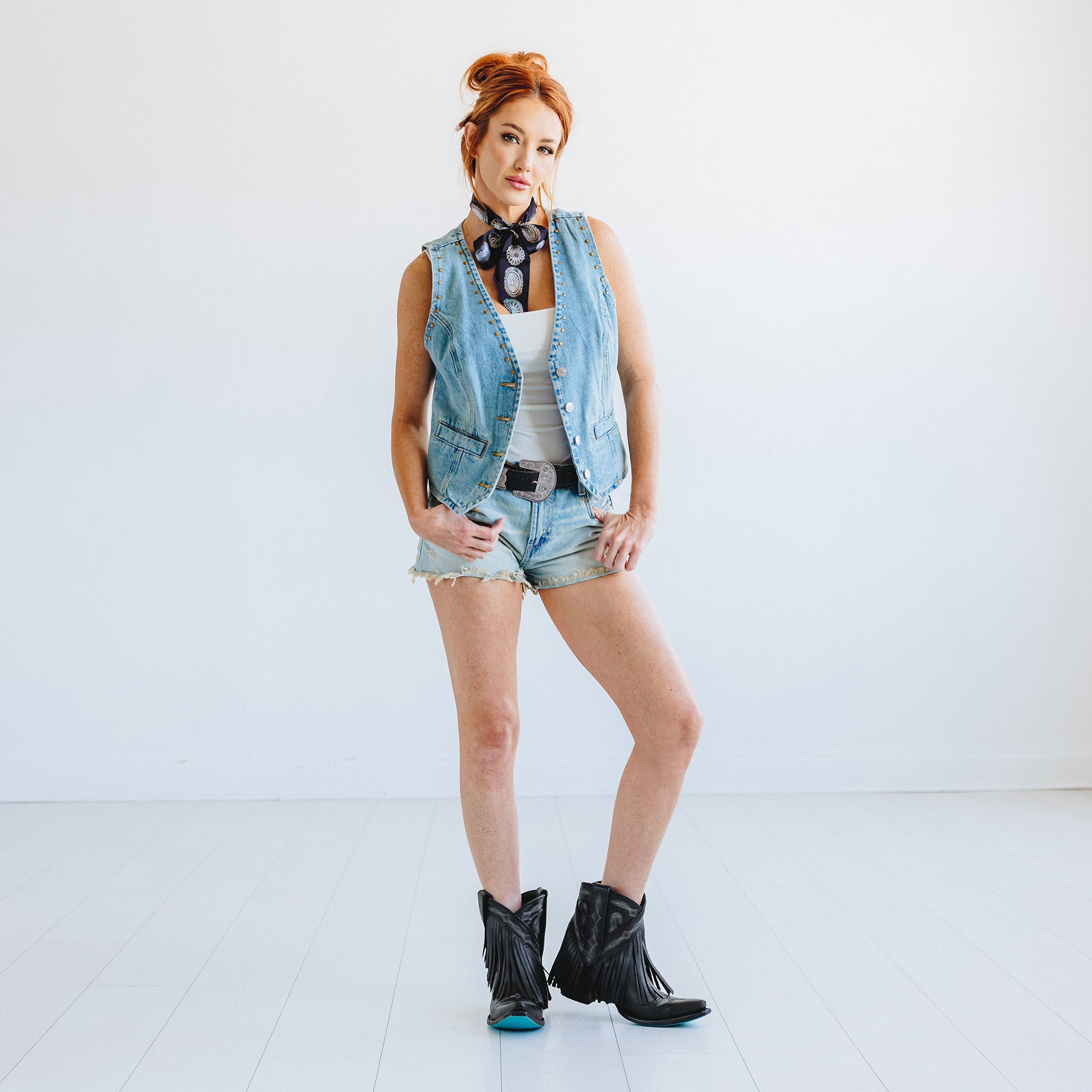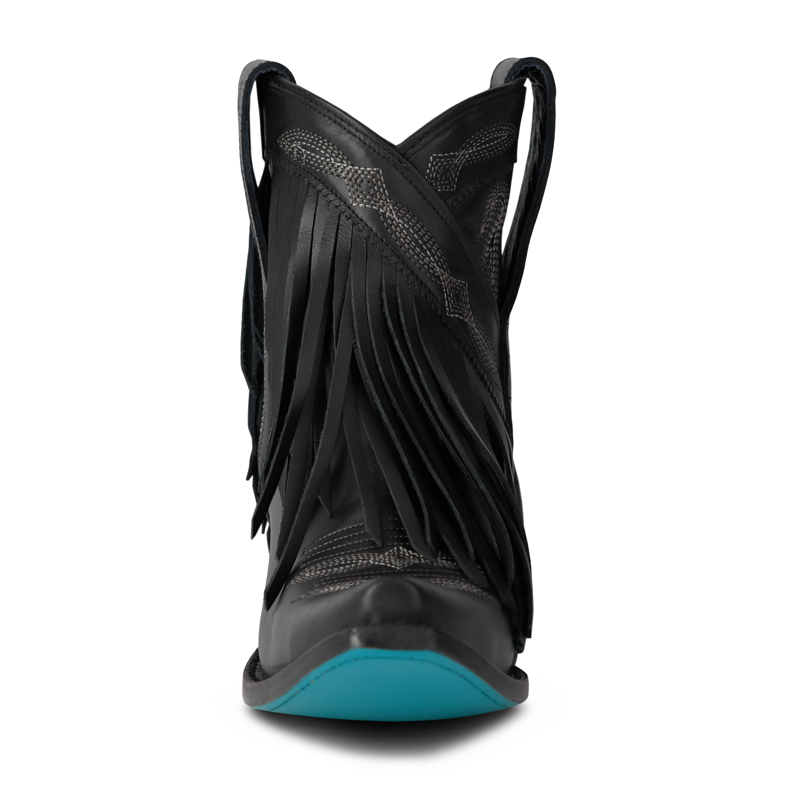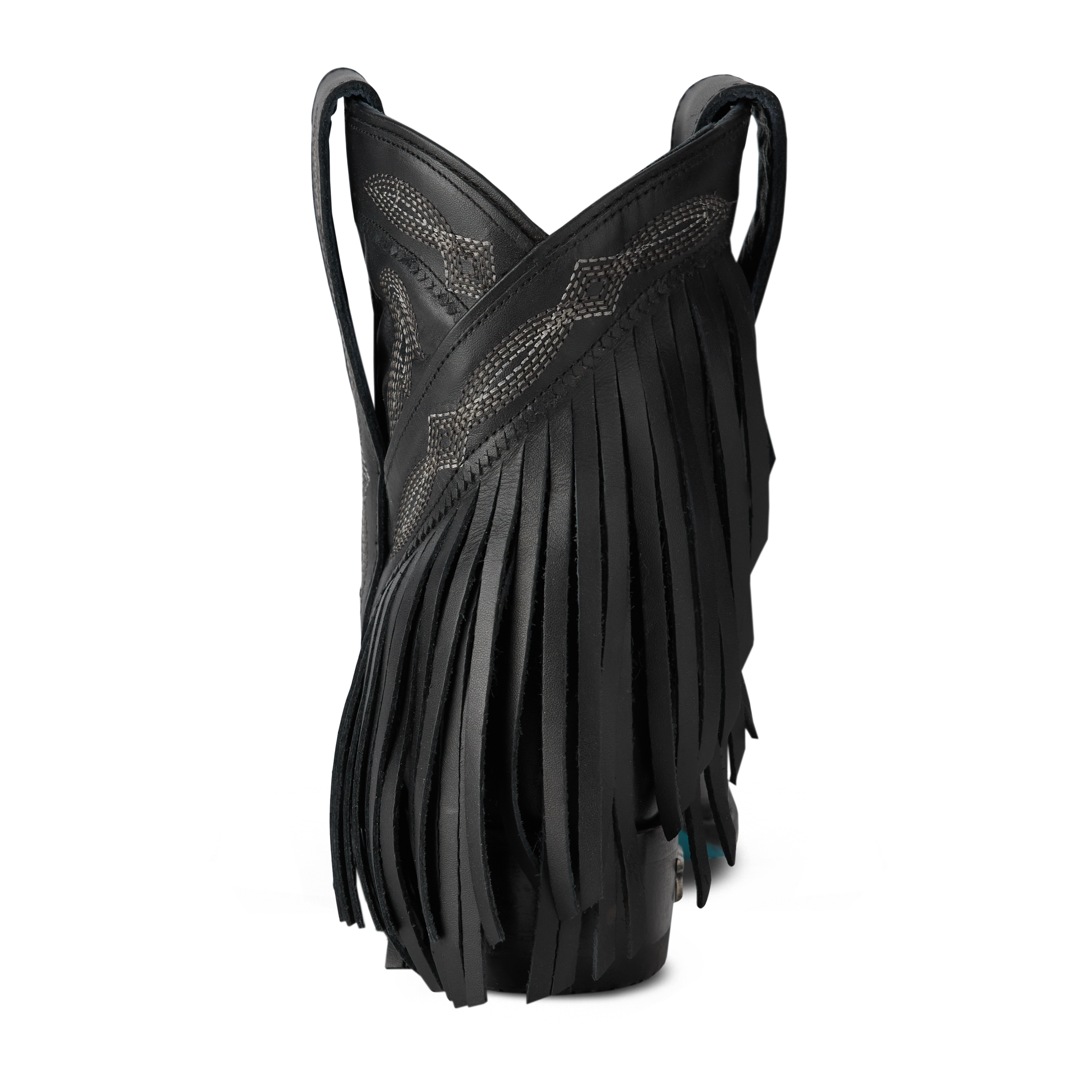 From rodeo to runway this chic boho western cowgirl bootie is ready for wherever the night takes you. A modern play on traditional flame stitch & asymmetrical fringe detailing. She's a must have in your closet. Dress her down with a chunky sweater and oversized blouse or spice her up for the ultimate girls night out with your favorite mini dress.
