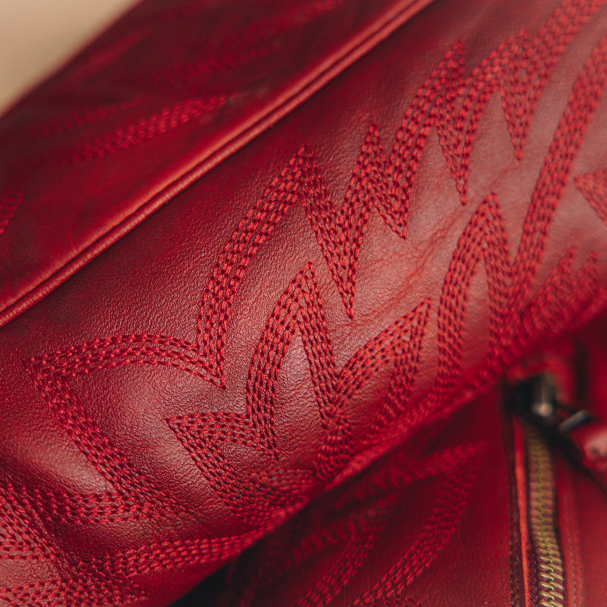 She's the perfect chic, red cowgirl boot right off the runway. This classic snip toe is accompanied by an abstract cosmic starburst pattern and retro-inspired toe stitch. Level up your wardrobe with this blue bottom hottie.