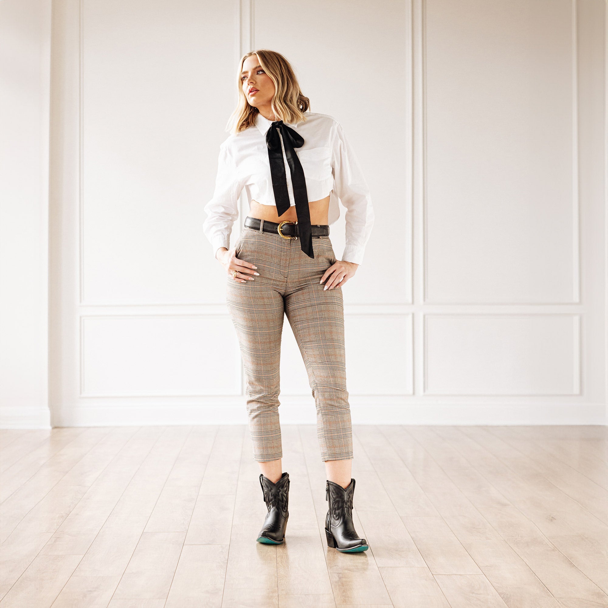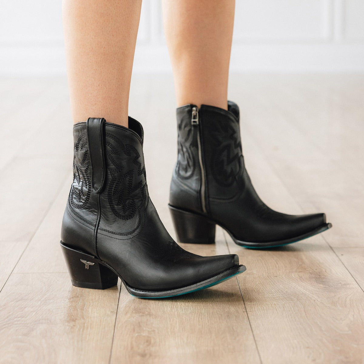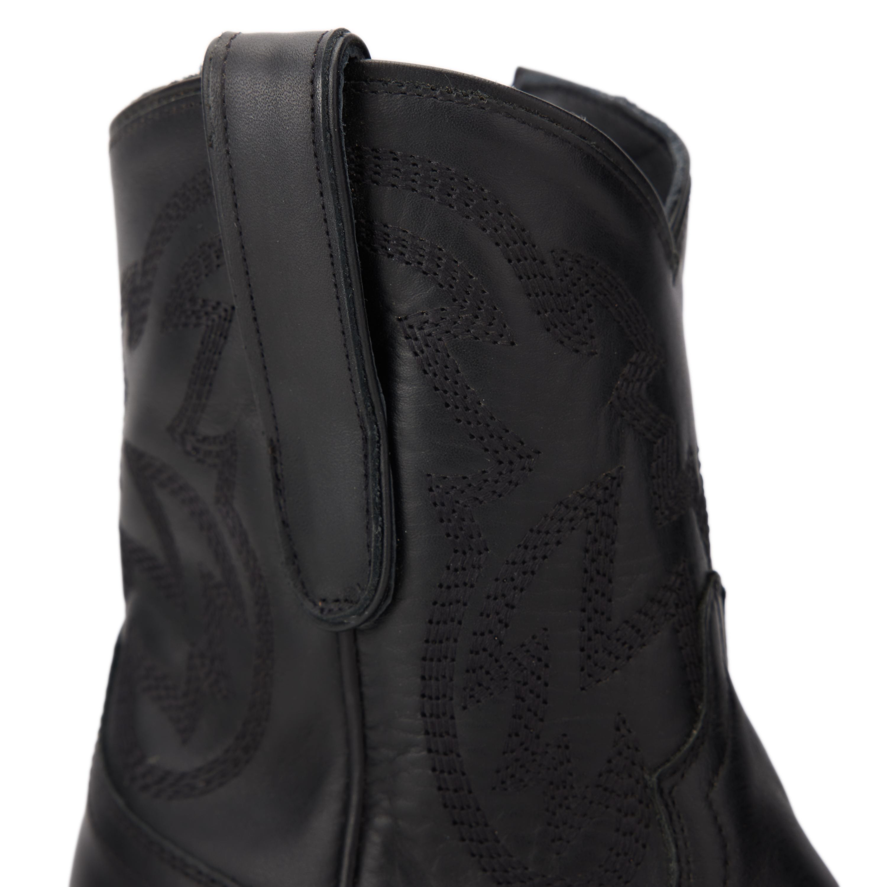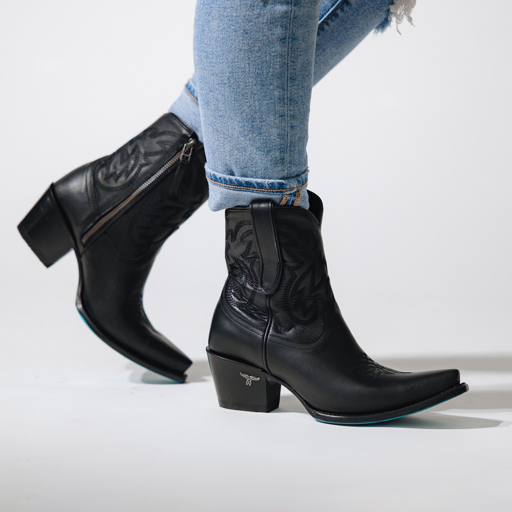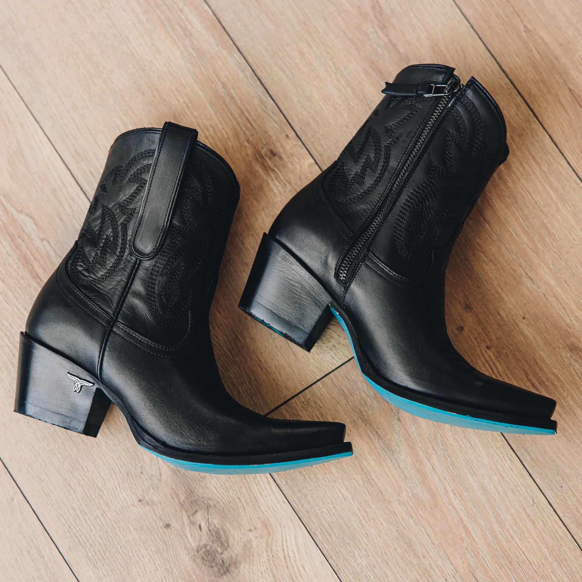 She's the same timeless renegade. A jet black cowgirl bootie right off the runway.