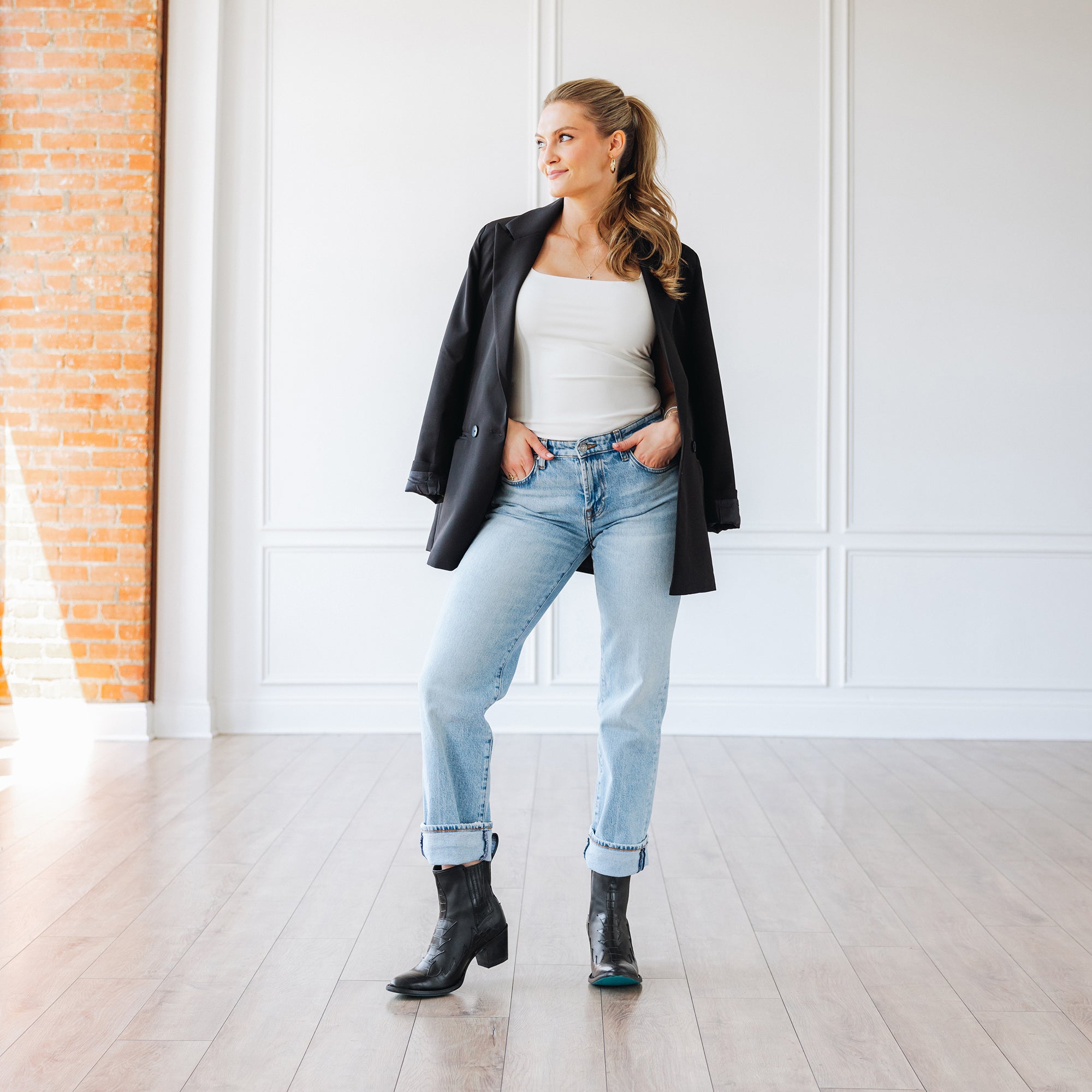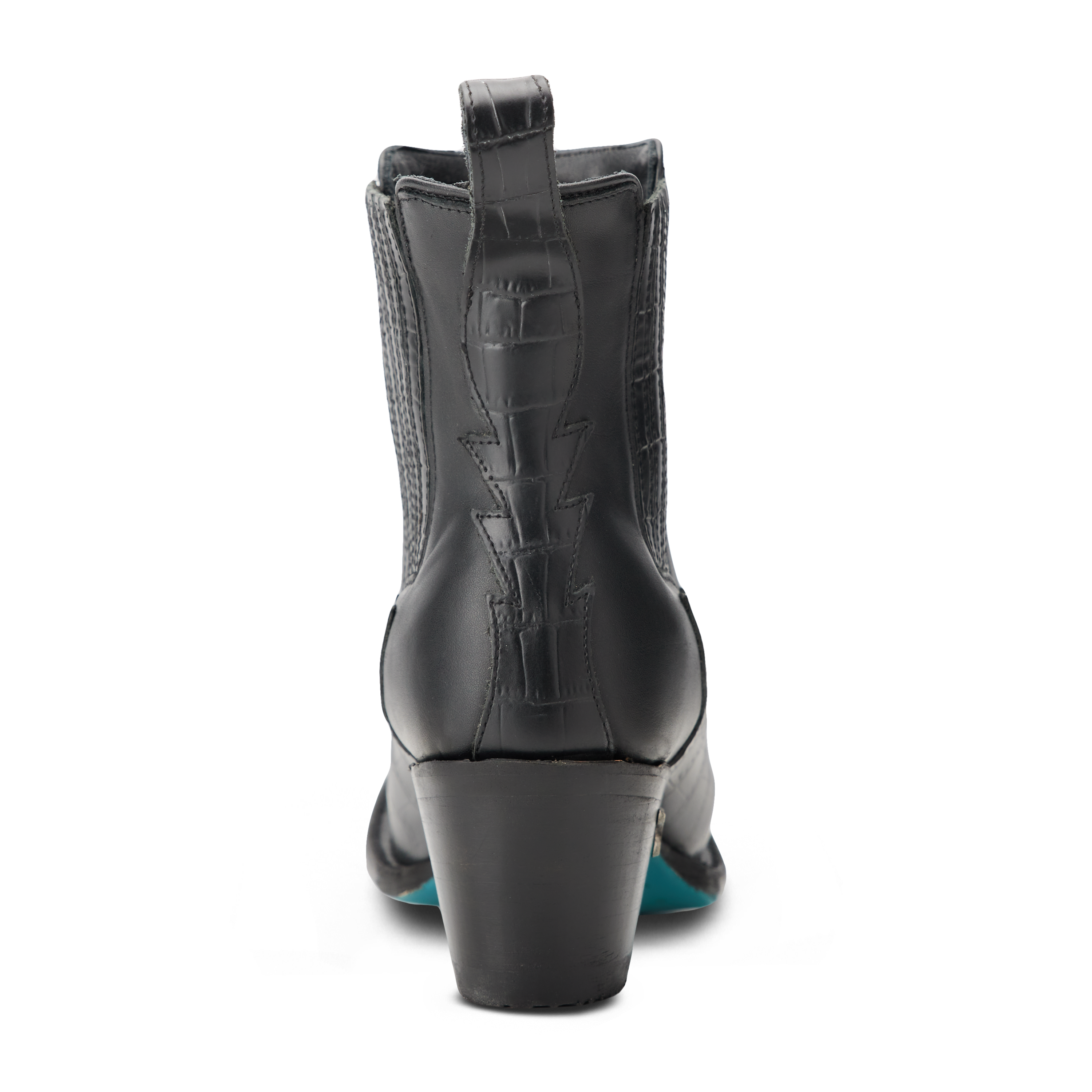 Breathe new life into a classic with this western-inspired Chelsea Bootie in Jet Black. Designed with a sleek, leather-covered elastic goring that frames the sidewall, this boot delivers effortless style and an ultra-flattering silhouette. The flame-stitched overlay motif brings an edge to the timeless Chelsea shape, with striking flame details running up the front and back—doubling as a pull tab for easy wear.