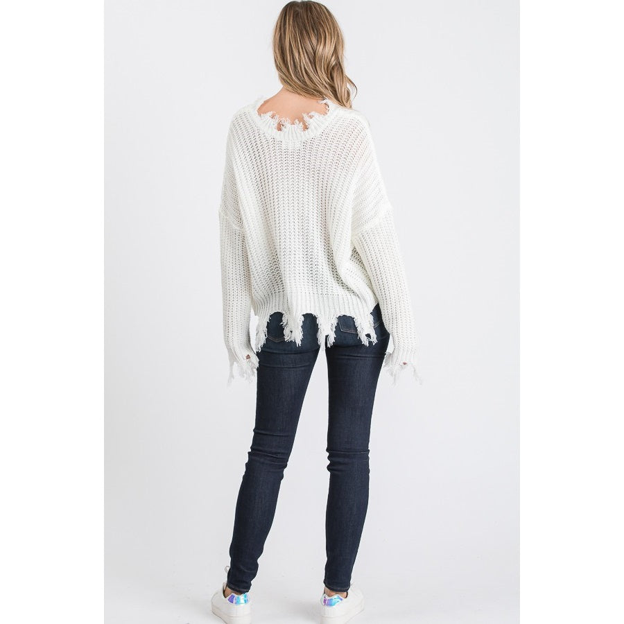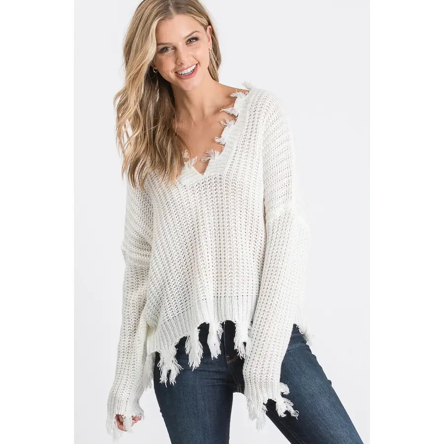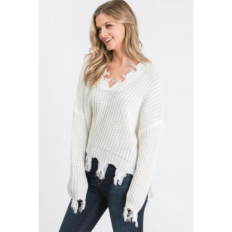 Embrace your edgy side with this distressed v-neck sweater—where vintage cool meets modern attitude. Featuring intentional rips and tears throughout, it's the perfect piece for anyone who loves a little chaos in their wardrobe. Layer it over a crisp white tee or wear it solo for maximum impact. This sweater proves that imperfection is totally in style.