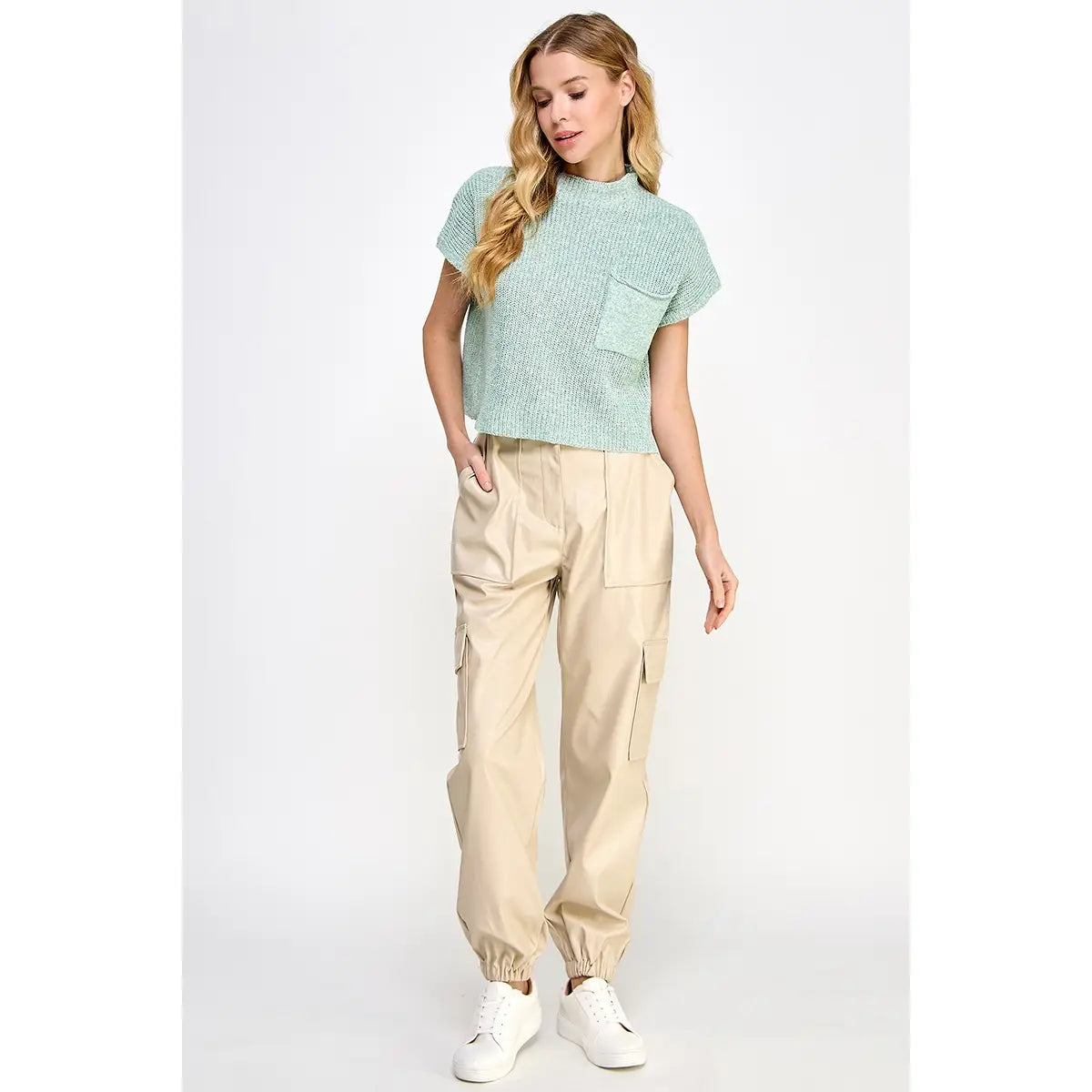 Sweater top made in rib-knit fabication - Funnel neckline - Front pouch pocket - Boxy fit