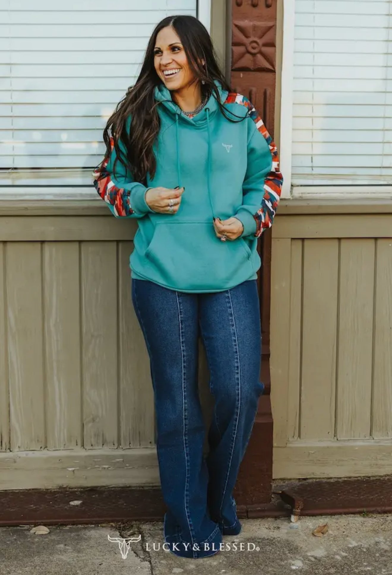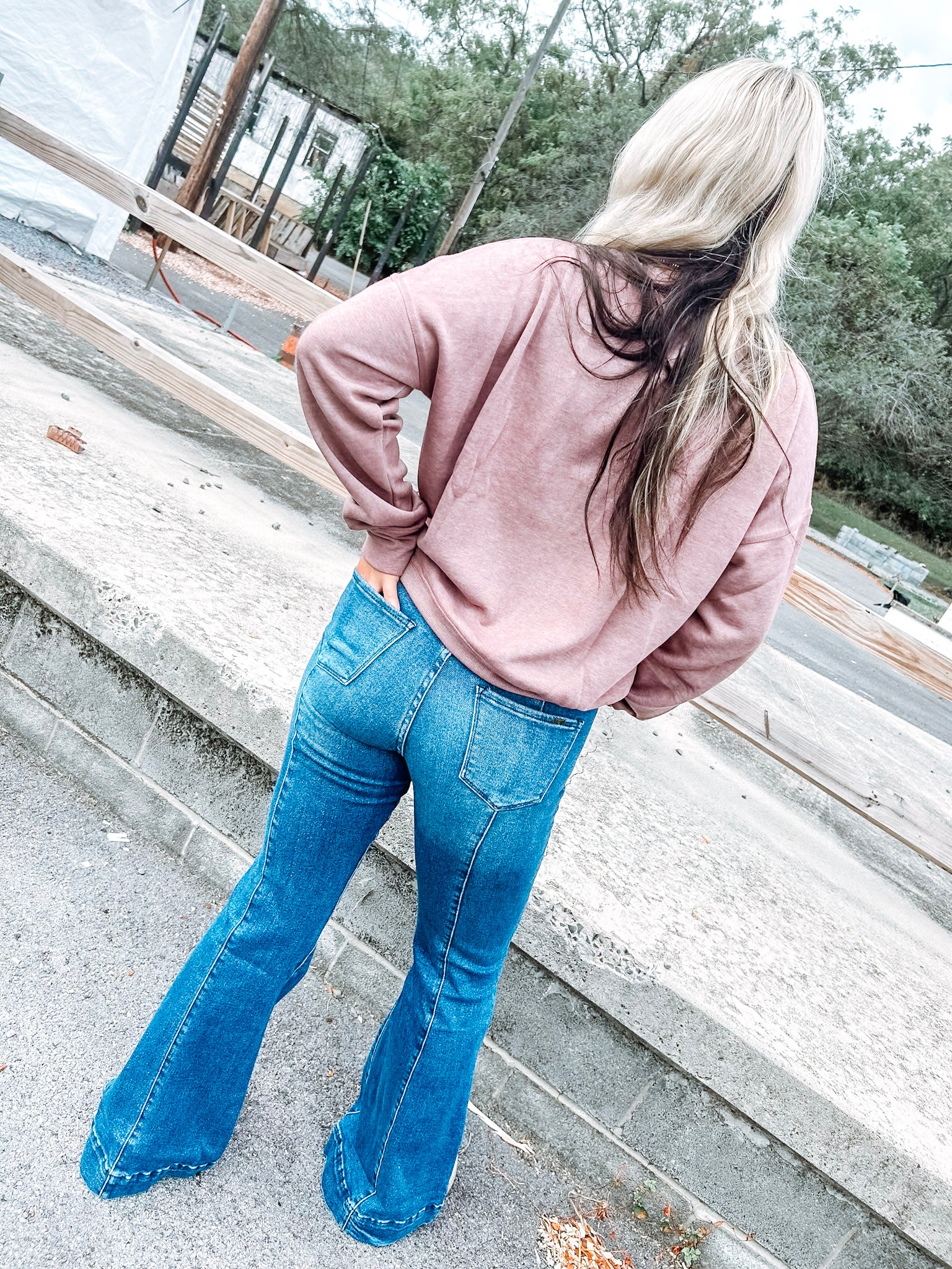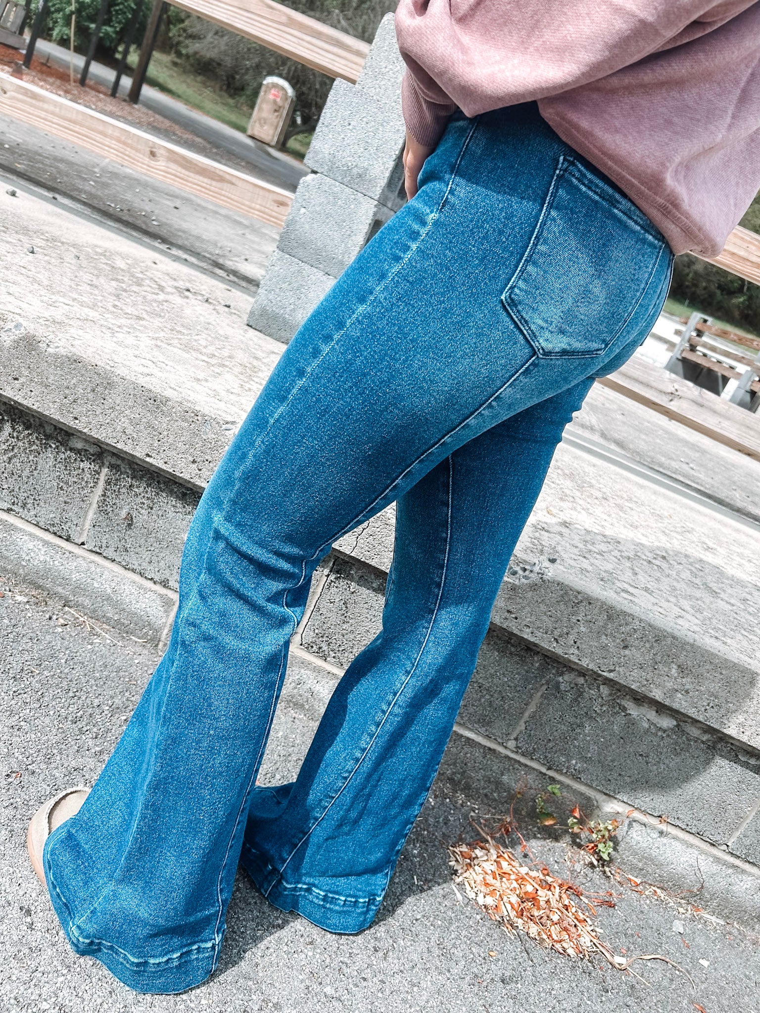 Denim full-length fit front crease flare jeans with five western pockets and a comfortable, adjustable elastic waistband that eliminates gaps in your waistline-featuring a curved back yoke that enhances the shape of your backside and is made from super soft, stretchy fabric for ultimate comfort.