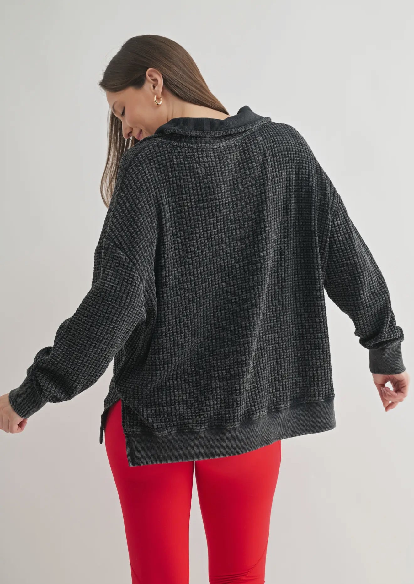 Effortlessly cool and endlessly cozy, the Chunky Waffle Mineral Wash Collared Sweater is your go-to for laid-back style. Made from a chunky, textured waffle knit cotton blend, it delivers warmth with a breathable, soft feel. The oversized fit and drop shoulders enhance its relaxed vibe, while the open collar neckline adds a modern, effortless touch.