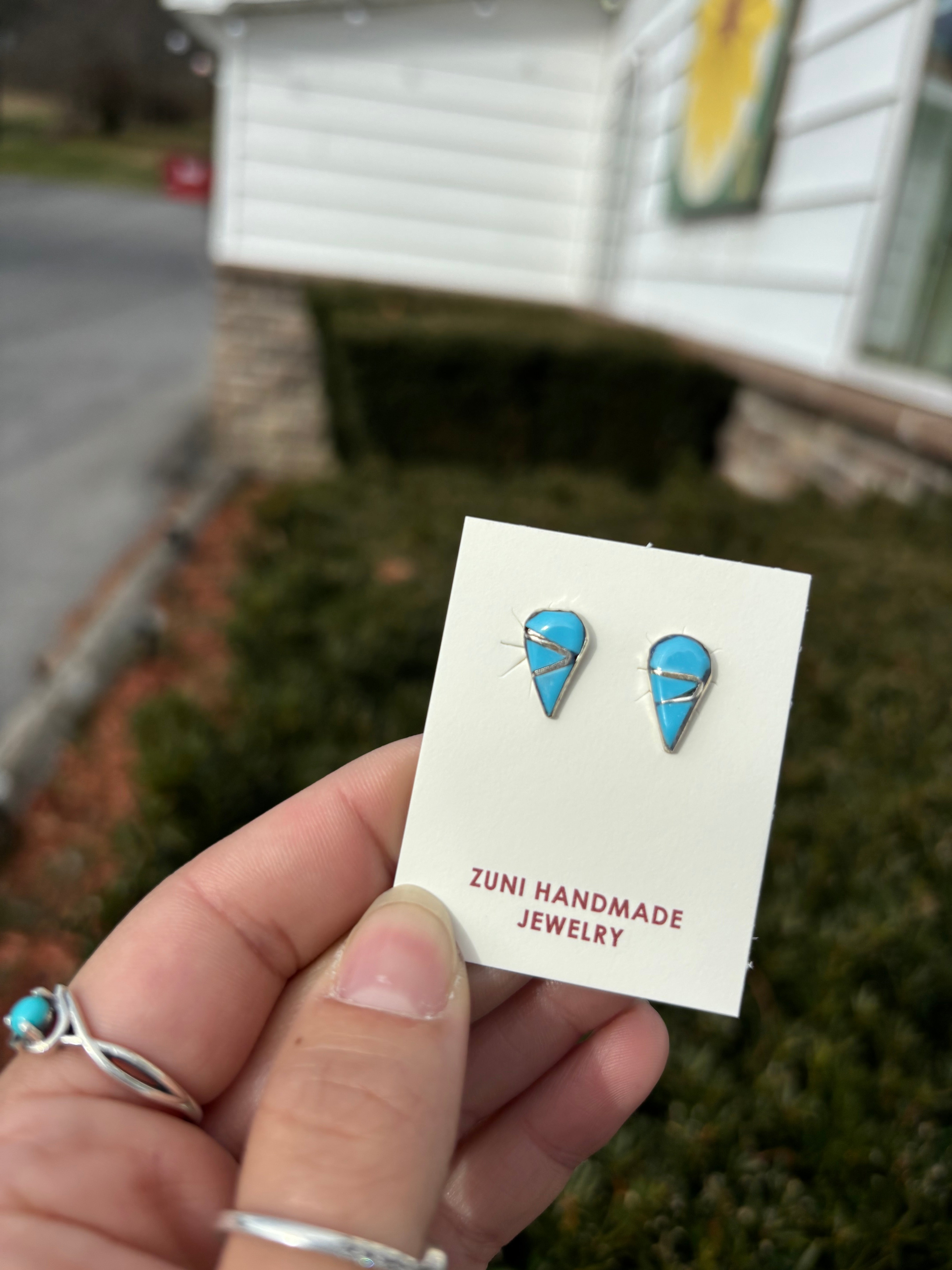 Handcrafted by Zuni artisans, these stunning turquoise studs showcase genuine gemstones set in beautifully detailed metalwork. Each pair captures the vibrant spirit of traditional Southwestern design with a modern edge. Perfect for adding a pop of color and cultural artistry to any look—whether you're dressing up or keeping it casual. A timeless piece that celebrates authentic craftsmanship and natural beauty.