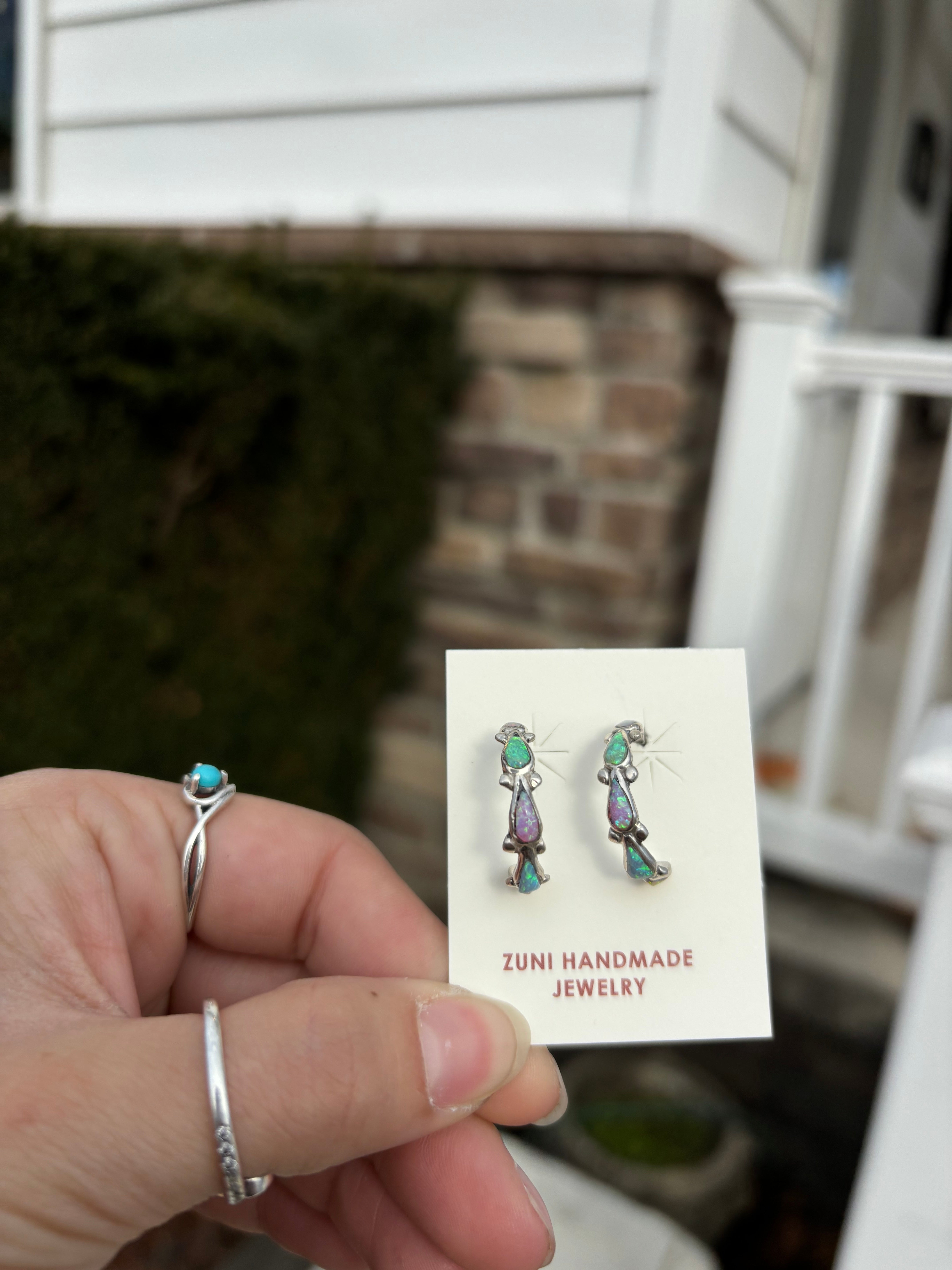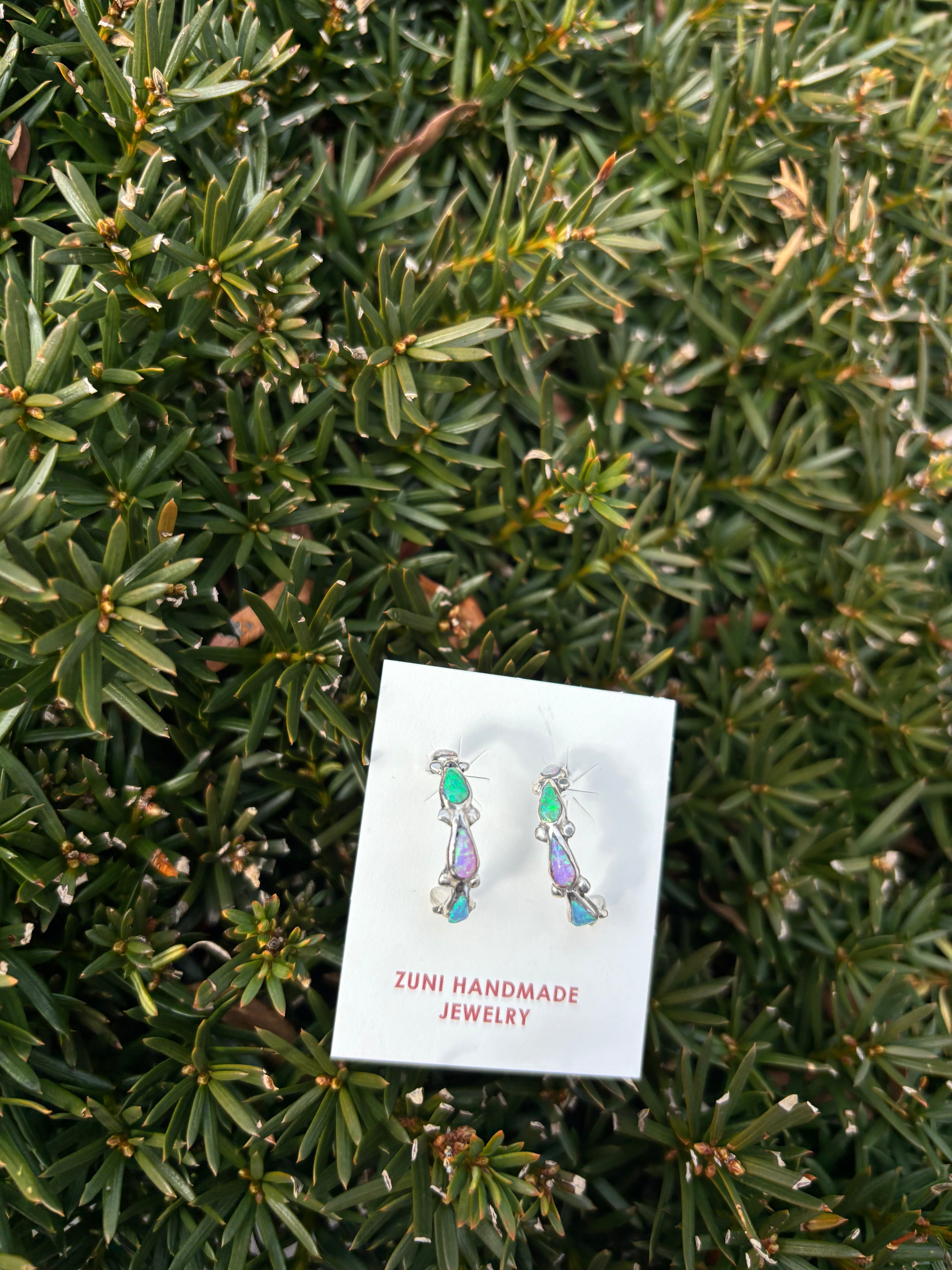 Sparkle with Zuni artistry! These sterling silver earrings feature stunning handcrafted opals that dance with rainbow fire. Each pair is a unique masterpiece, showcasing the traditional techniques of Zuni artisans who've perfected their craft for generations. Perfect for adding a touch of southwestern charm and natural beauty to any outfit. Lightweight, wearable art that tells a story.