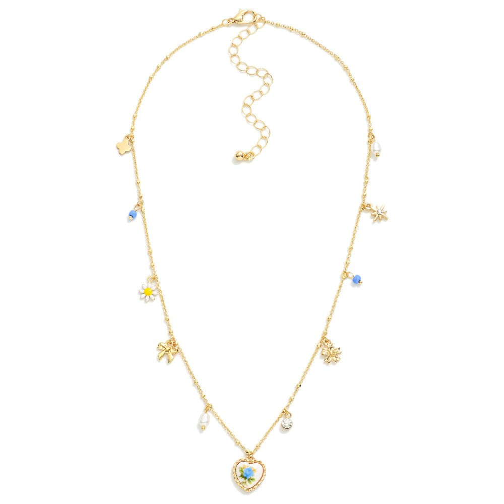 This Vintage Heart & Charm Necklace features a beautiful vintage charm that hangs on a delicate gold necklace. A perfect accessory for those who appreciate classic and timeless style. Add a touch of elegance to any outfit with this intricate piece.