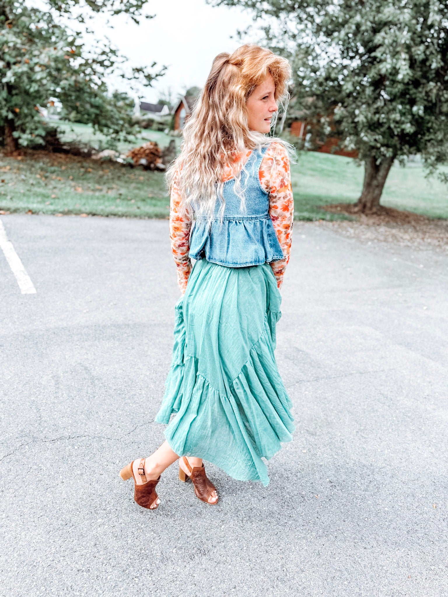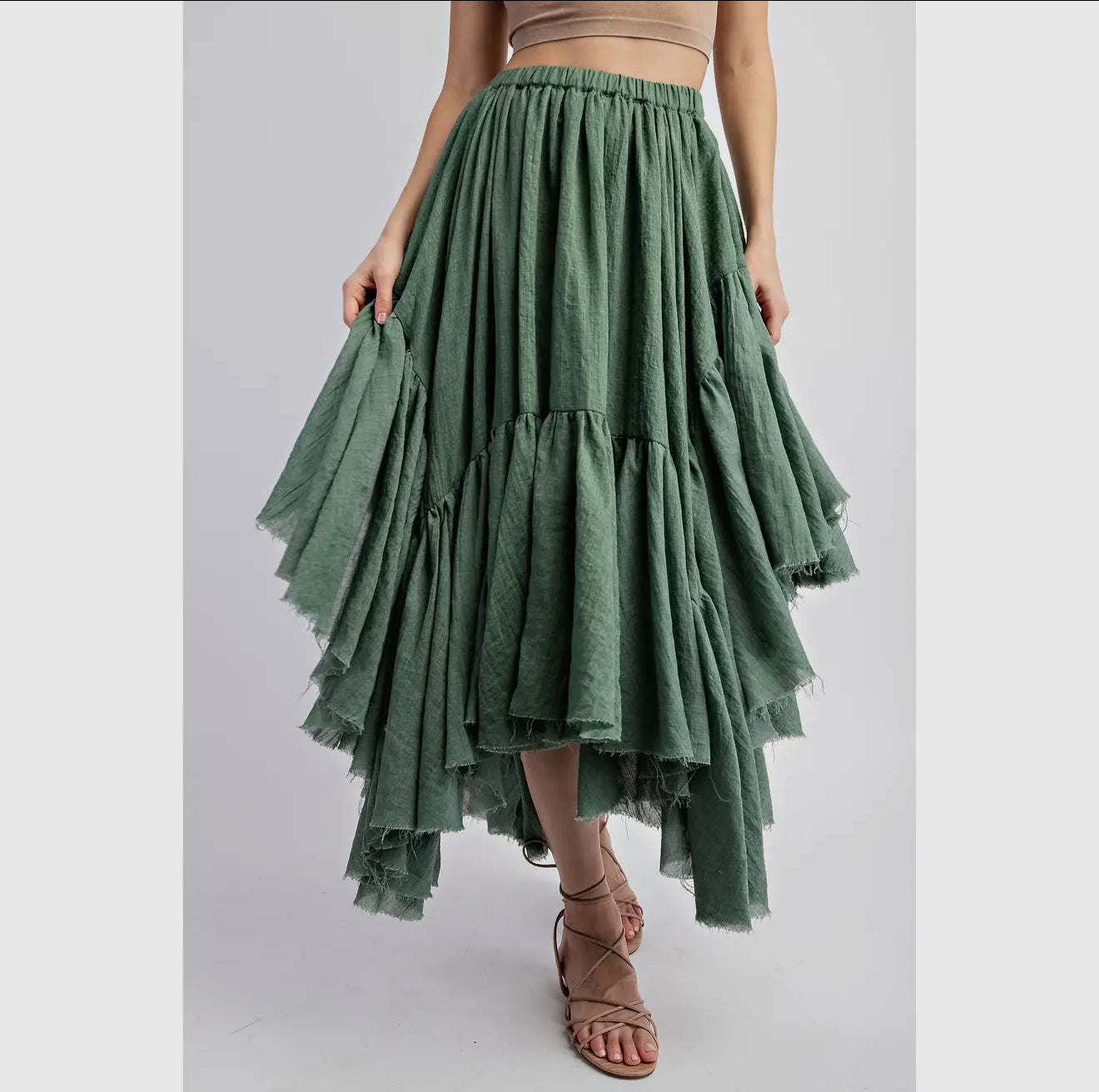 - Pieced tiered trimming and asymmetraical hem with raw-edge