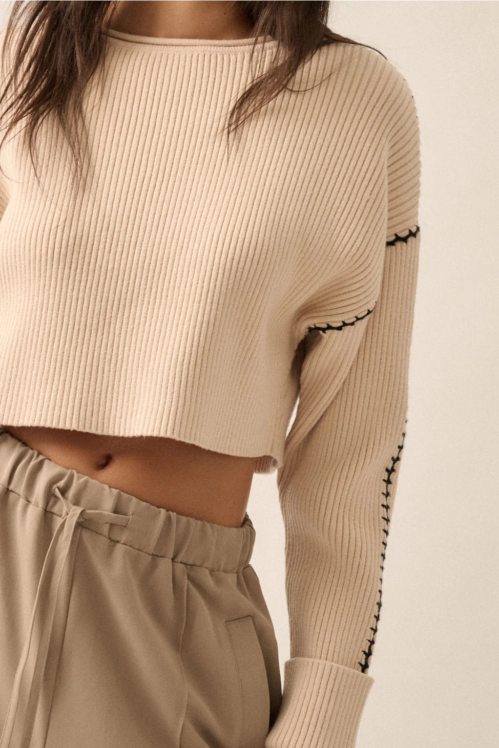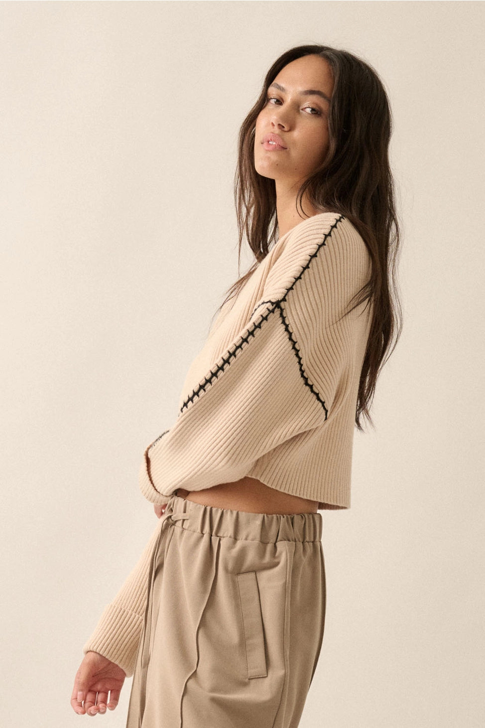 Solid Round Neck Rib Knit Stitch Seam Sweater